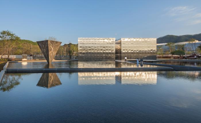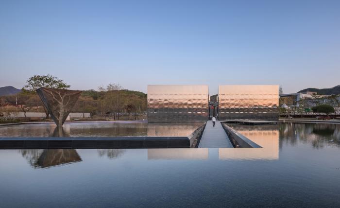 该项目的场地是一个用于种植并培育松树幼苗的农场。场地周围大多是耕地,平缓的山坡上坐落着几栋汽车旅馆。站在场地中,唯一能看到的景观就是山脊。该项目的业主提出需要一栋四层楼高的建筑,并希望在建筑中包含咖啡馆、餐厅、仪式场地以及画廊等项目。但是这样的建筑和一个大型的汽车旅馆并没有什么不同;唯一不同的可能就在于,这个建筑是单独矗立在一个平坦的场地中的。于是,我们提出了一种设计方案,建筑形制模仿的就是牙山市传统的住宅,建筑中包含着据有地方特色的水景与花岗岩制成的石墙。首先,我们在场地中创造了一个广阔的水域,由单层建筑组成的单体建筑散布在整个场地中。此外,水景周围还筑有混凝土墙和石墙,使得人们难以转身。在第一次展示中,业主被建筑师荒谬的建议震撼到了;但经过几天的思考,他决定接受我们的想法。