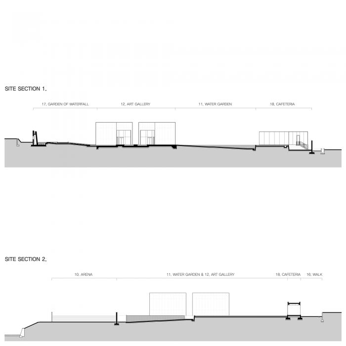 该综合体由4个区块组成,位于不同的场地上,每个区块的高差近2.3米。为了克服这种高差,我们在场地中创造了一个横跨水面的45米长的外部坡度。透过水墙之间的灯线,参观者在体验空间上垂直变化的同时,也能慢慢地感知隐藏的空间。这是一种戏剧性的体验,通过视平线的变化来认识到整体的变化(从超过人的身高的墙壁高度到超过水池边缘一英尺高)。此外,每个建筑体块外都有一个用作大堂和走廊的空间。这个外部装置能够让观众在室外感受建筑本身,这是一种能够让人体会到建筑和自然之间模糊边界的设置。