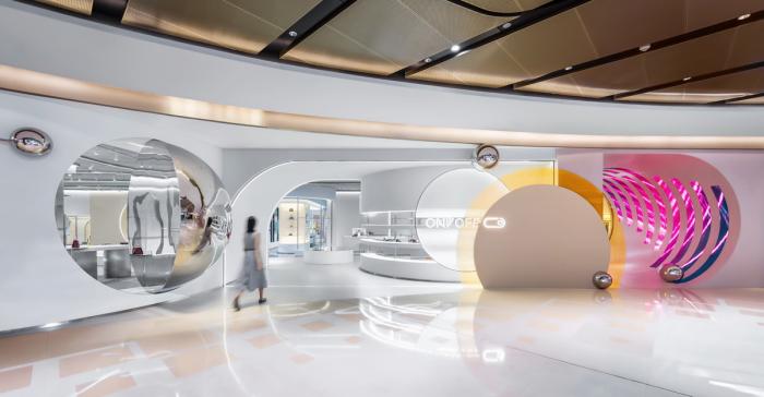 店铺整个开放式流线型的外立面,对原有店铺边界进行了解构重组,创造出内部与公共区域之间多变的空间交互关系。从最左侧的场景式橱窗,到色彩鲜明的圆形产品产列,到开放式的重点产品陈列区,让经过的客人可以从外部空间感受到品牌与产品的魅力。入口处可旋转的超大镜面不锈钢球形艺术装置折射周围的场景变化;最右端的Pop-Up区如洞穴般的神秘通道,订制的LED曲面软屏利用动态的数字内容快速提升空间氛围和商业趣味。