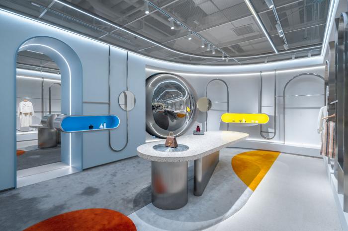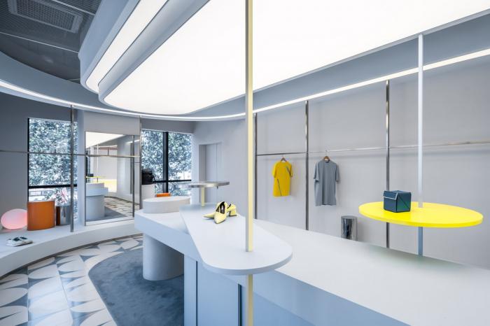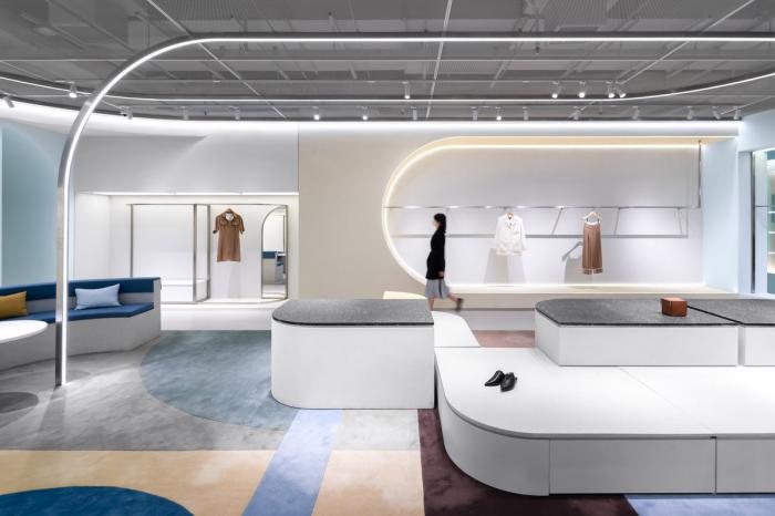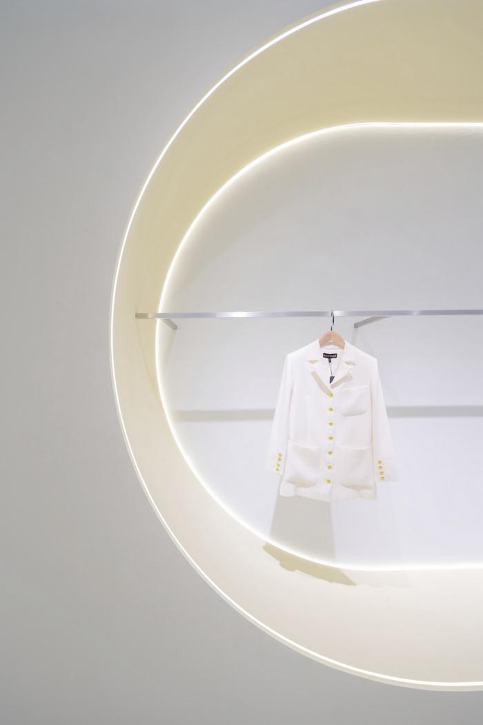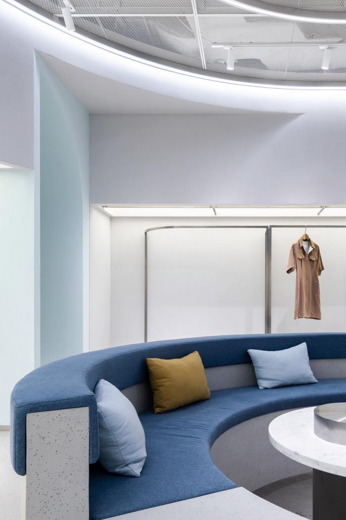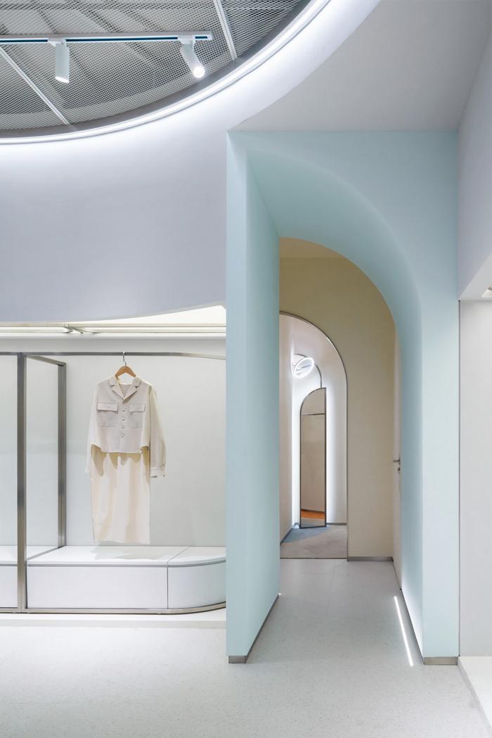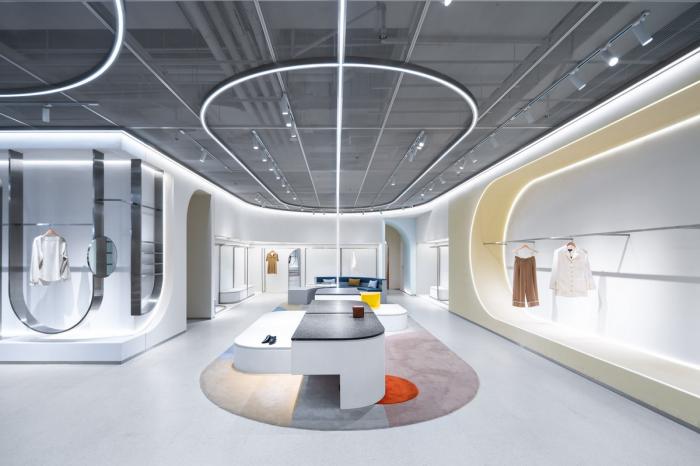 高矮不一的半弧形墙壁,与衣服的裁剪融为一体,仿佛是“量体裁衣”定制一般。墙壁上的弧线与屋顶弧形天花延伸至地面的弧线互相交织,营造出曲线美的同时也自动分流了顾客的购物路线。空间顶部线条纵横交错的天花内嵌了灯管,与室内的照明形成交错的光线分布,与镜子层叠映射出层次感。墙面整体柔和的颜色与不同区块活跃明快的彩色几何拼接地毯与墙面的色调互相均衡,完美的进行了活力与质感之间的衔接过渡。精选的定制水磨石,天然大理石等材料,保留着原始的打磨痕迹,与衣物的手工剪裁纹理相碰撞,仿佛让人置身于抽象派和构成主义的美术馆之中。