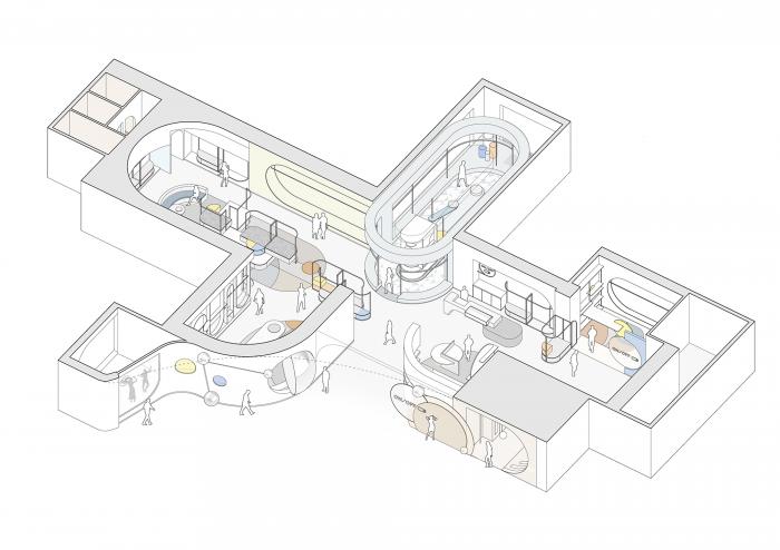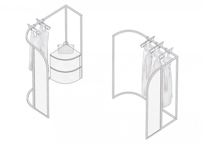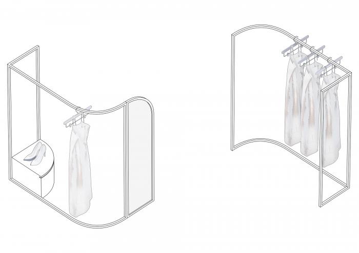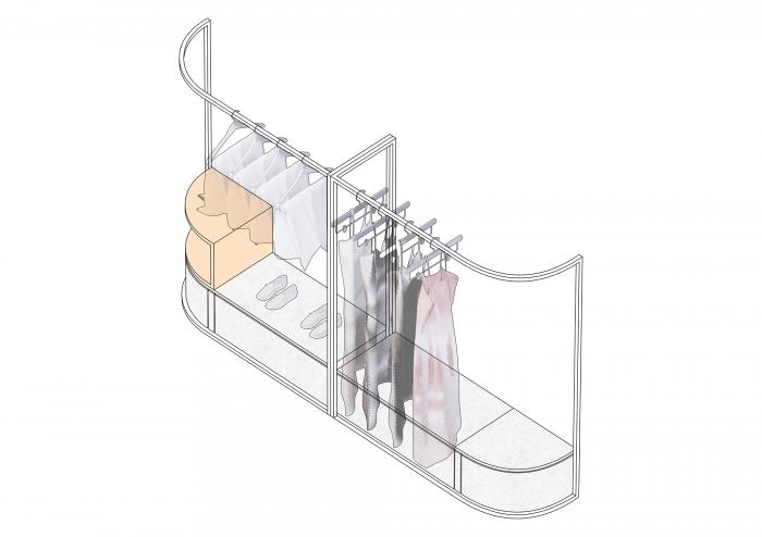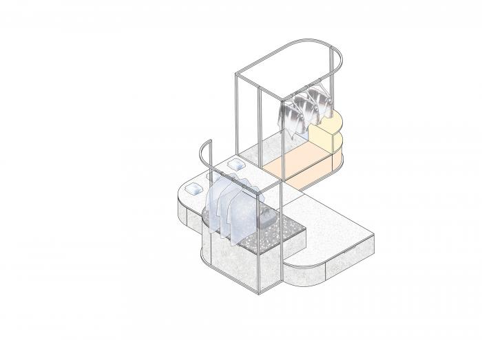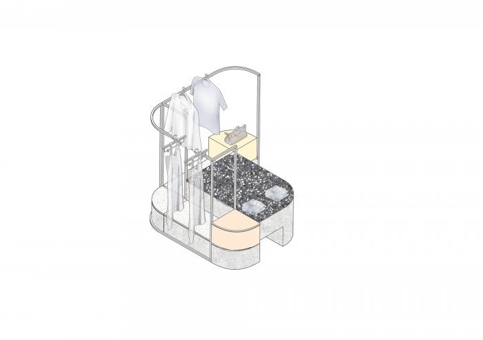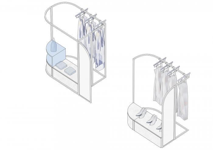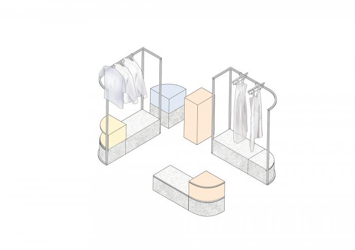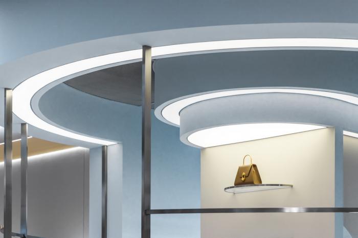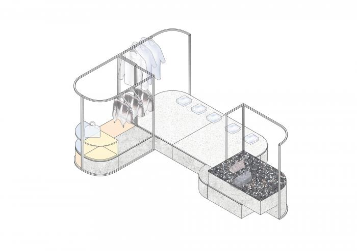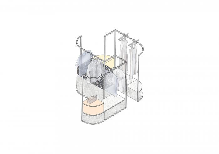 高矮不一的半弧形墙壁,与衣服的裁剪融为一体,仿佛是“量体裁衣”定制一般。墙壁上的弧线与屋顶弧形天花延伸至地面的弧线互相交织,营造出曲线美的同时也自动分流了顾客的购物路线。空间顶部线条纵横交错的天花内嵌了灯管,与室内的照明形成交错的光线分布,与镜子层叠映射出层次感。墙面整体柔和的颜色与不同区块活跃明快的彩色几何拼接地毯与墙面的色调互相均衡,完美的进行了活力与质感之间的衔接过渡。精选的定制水磨石,天然大理石等材料,保留着原始的打磨痕迹,与衣物的手工剪裁纹理相碰撞,仿佛让人置身于抽象派和构成主义的美术馆之中。