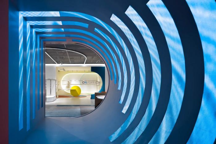 ON/OFF是一家属于复星集团和BFC旗下、拥有众多顶级独立设计师品牌的买手店。它位于上海外滩金融中心商业区,由SLT设计工作室(STUDIOLITE)最新设计完成。设计旨在一个自由的空间中给顾客提供有趣而又艺术性的购物体验。通过明暗交错的灯光变换,精选色彩的组合,灵活可变的装置系统以及精致材料的碰撞构造了一个充满都市年轻活力的流动性空间。