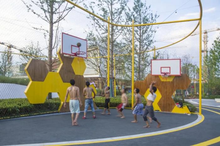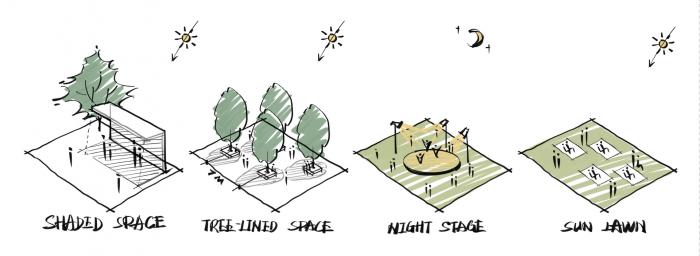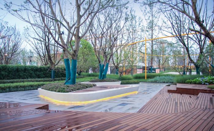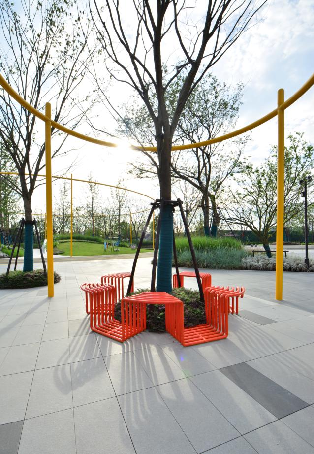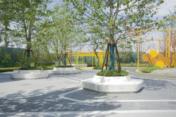 同时,多功能草坪能根据社区的需要,摇身变成舞台、周末跳蚤市场、草坪派对、林下休憩等功能场所,给社区居民提供多元的交流平台。