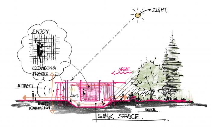 以人为本是我们的设计出发点,在更广泛的维度去研究场地活力。我们有意去营造出向心的、有凝聚力的、森罗万象的空间。极具可持续与适应未来发展的属性,它是最具有生命力的空间。因此,它不单纯是个“环”,它象征着场地的巨大潜力,和人们对未来的期待。