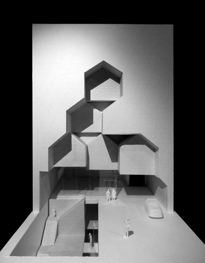 建筑的形状是根据村庄的形象形成的,整体就像小堆房子堆砌在盒子里。纯白盒子和砖房在形式、色彩和纹理上形成对比,增强了雕刻的效果。雕刻的村庄在室内空间里完全颠倒过来,形成了供商店和艺术家工作室使用的小型山墙房屋。