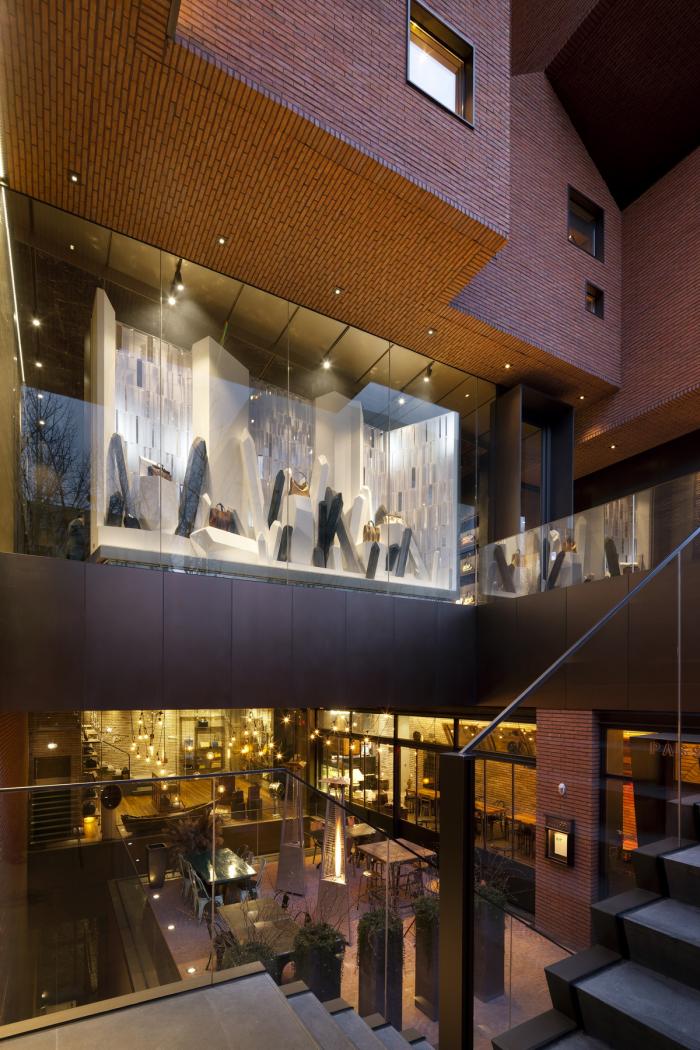 作为设计竞赛的获胜者,TRU建筑事务所+Eho曾为店面概念和建筑设计工作。对于一个拥有悠久制造历史的奢侈品牌,我们提出了“村庄”这一概念,其中容纳了品牌新产品、工匠和艺术家。该村庄创造了协同创作的平台,老皮革工匠正在与新兴设计师们一起工作。“合作村”的概念反映了Simone的商业文化,Simone在手袋设计方面一直与年轻艺术家合作。