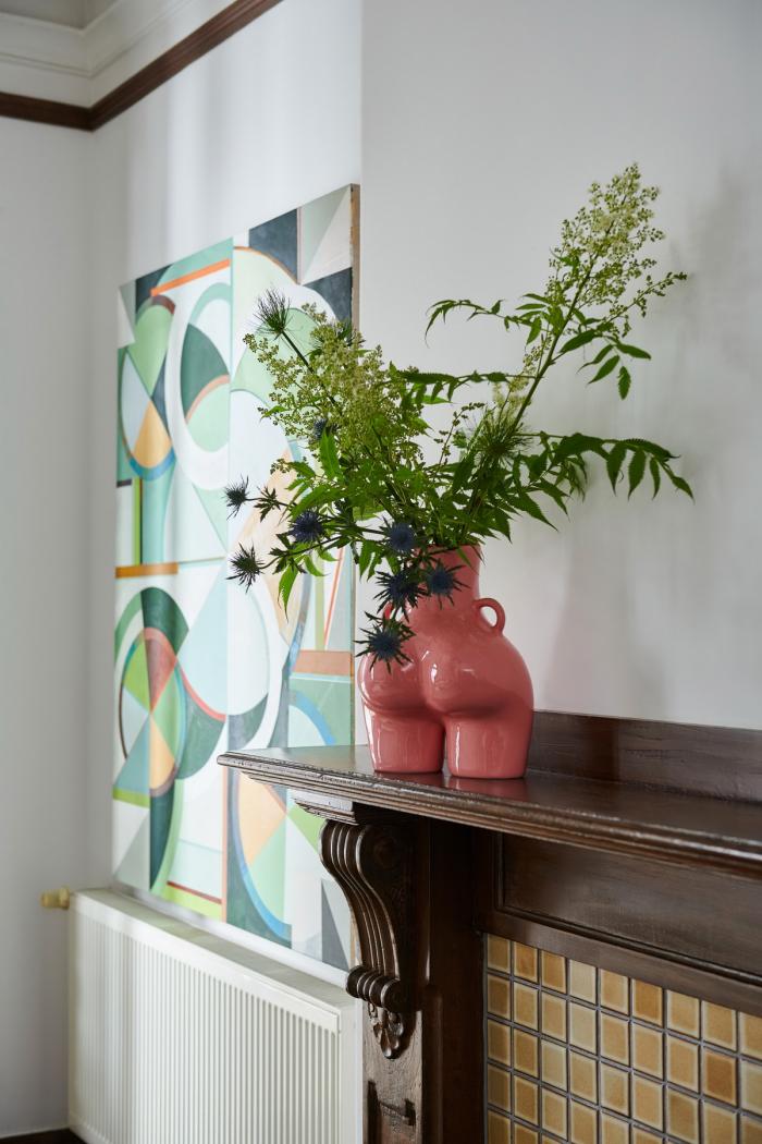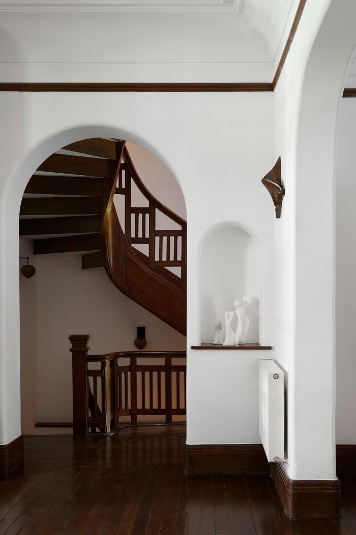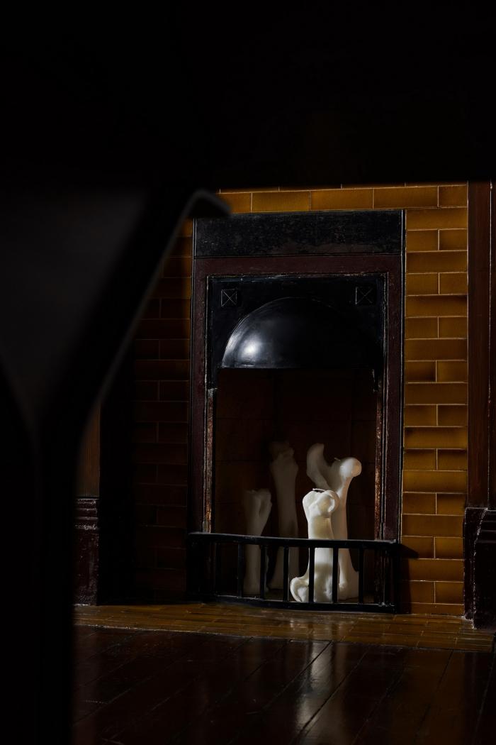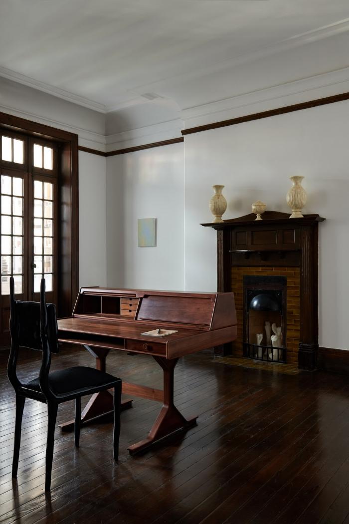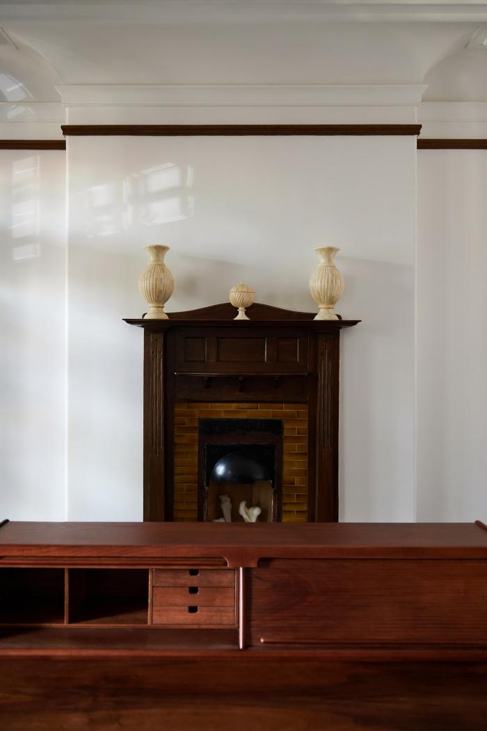 二楼的空间中设置了一个更为静谧的场所:一张1950年代的古董书桌,它由意大利著名建筑师和设计师Gianfranco Frattini设计,搭配来自巴黎的品牌R&Y Augousti的经典设计之一——Eden Chair(伊登椅),笔壳和青铜搭配了黑色的马毛,具有异域风情的造型,为空间带来一种神秘感。火炉上是主理人在摩洛哥旅行时的意外发现,这是三只由骆驼骨制成的器皿,都是当地匠人手拼接工制作而成,十分罕见稀有。与之相呼应的是壁炉内骨头造型的天然蜡烛,由Studio Morrison设计。