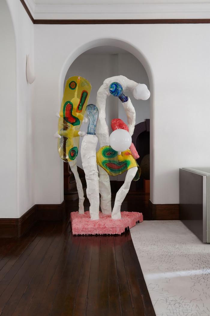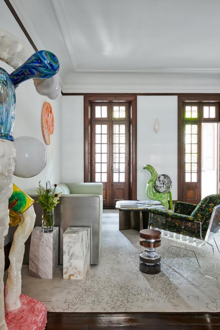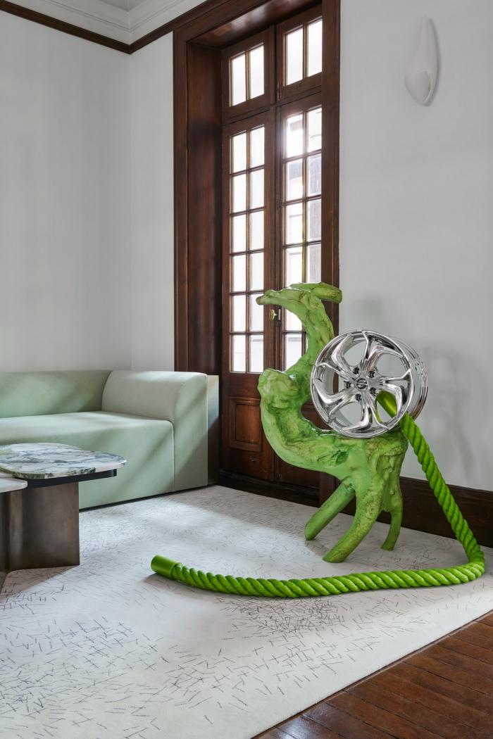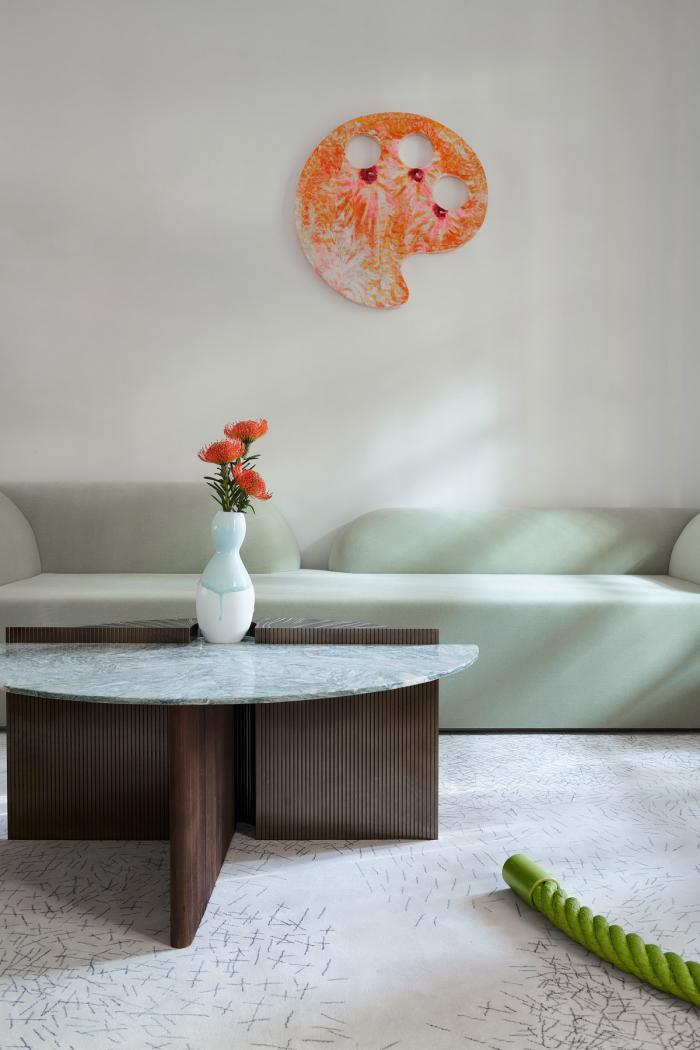 在这一层的展厅中,沙发、茶几、灯具、艺术品,这些看似简单的生活单品有着最质朴又发自内心的叙述——Living with Art (与艺术生活在一起)。这里也仿佛Coexist展览的客厅,映入眼帘的是略带莫兰迪灰的青绿色马海毛对半沙发、圆润活泼,一旁来自美国艺术家Brecht Wright Gander和他的团队手工制作而成的灯具。