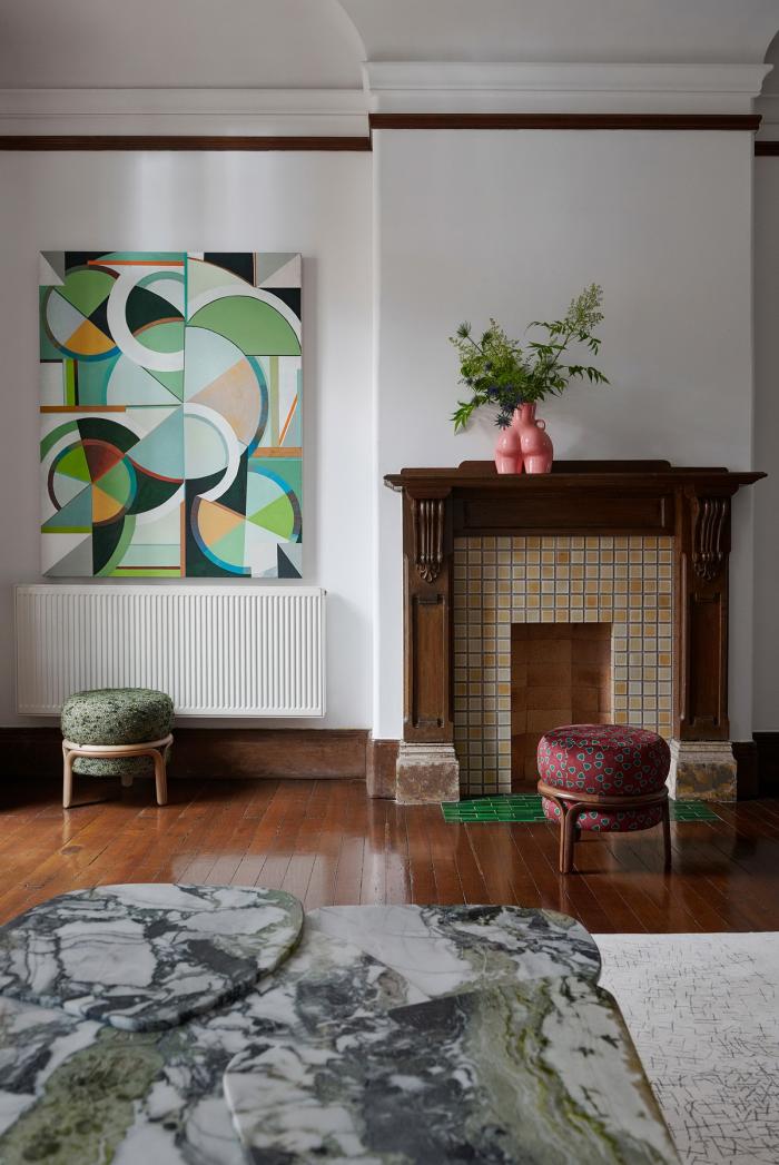 在客厅的壁炉旁放置着两张由橡木和布面拼合制作而成的圆凳,充满肌理质感的面料配合了圆凳小小的体积,使它具备了美观与实用性。