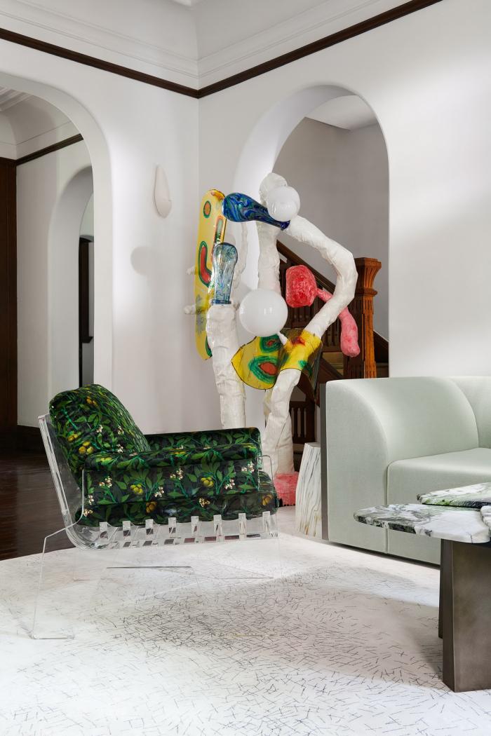 而沙发旁的“漂浮椅子”,由实心亚克力模具支撑,搭配来自Fabric Union的艺术印花面料,真如悬浮坐在云端。