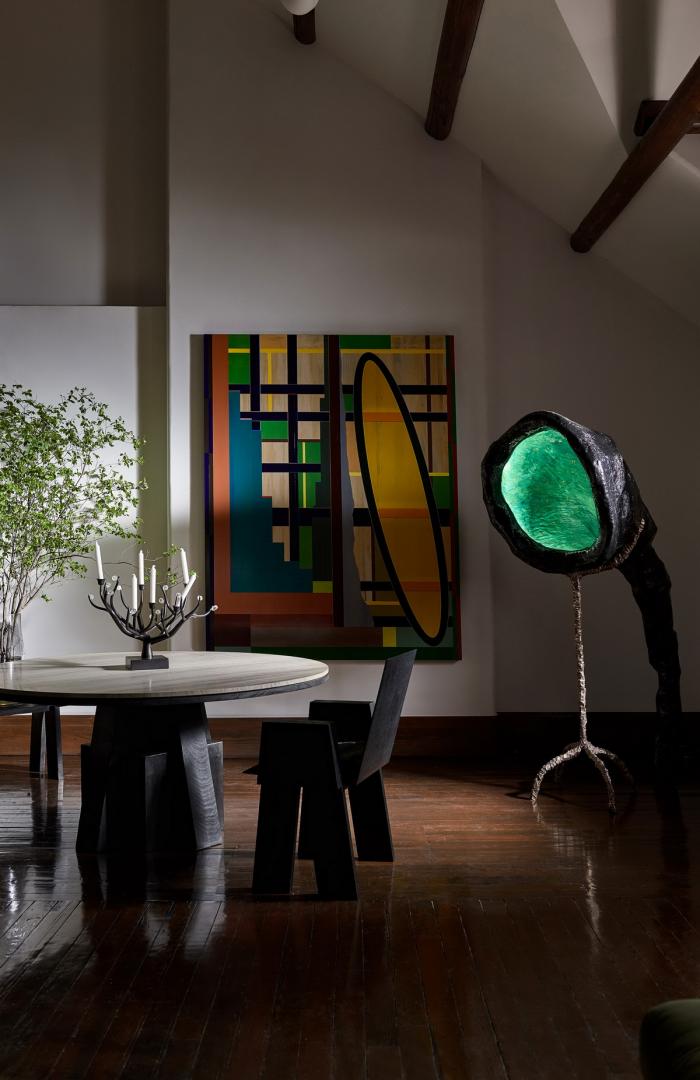 充满韵味的旋转楼梯之间,悬挂着同样来自Bryce Cai设计的“Back Stage”艺术挂毯,表达着年轻一代的内心呼声——做自己、展示自我。来到顶楼,首先用艺术家Arno Declecq的圆桌与餐椅作为开场,Arno的设计极具自然简约之美,通过简单的黑色橡木,他完美地将西非中独特而又神秘的部落艺术融入其中,却也能完美地与周围家具相调配。
