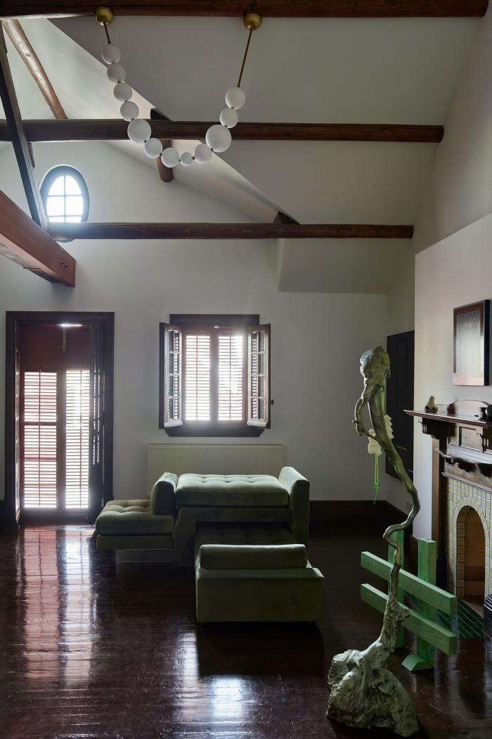 沙发前的绿色“冷翡翠”大理石茶几采用了叠加石板的手法,打破传统思路。用材质的叠加丰富设计层次与使用感受。