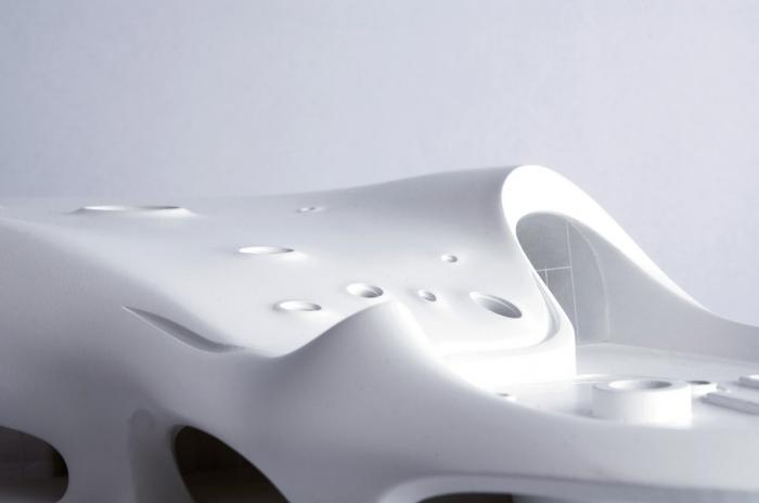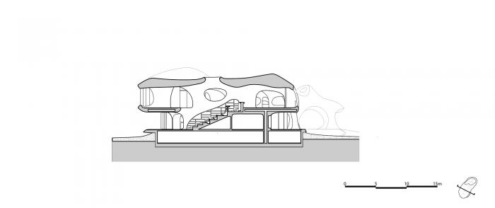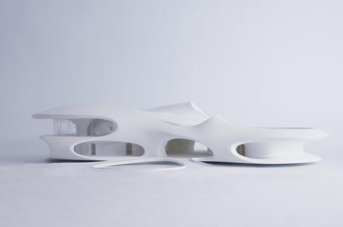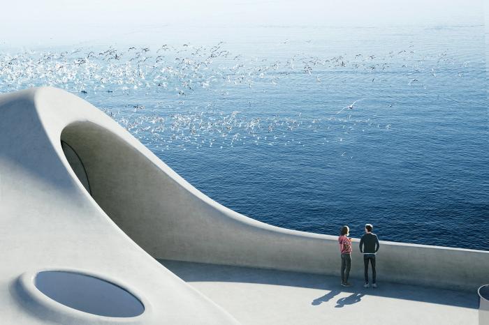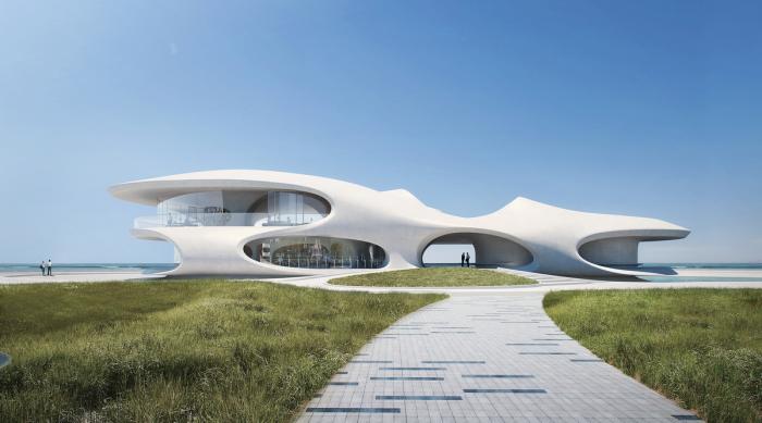 建筑由白色混凝土一体浇筑成形,内外合一,形成多个半室外空间和平台。卷曲的混凝土墙体,既是有机形态的建筑结构,也是连接不同空间的纽带,墙,地,天花融成一体。大大小小的孔洞是有机的呼吸口,也将自然光线引入空间的深处。建筑外围的回廊灰空间给海口炎热的环境提供了遮阳和通风,让过往行人可以驻足,观海休憩。