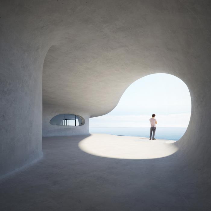建筑采用CNC模版进行混凝土整体浇筑,局部使用3D打印模版进行浇筑,以满足复杂的曲面混凝土墙面施工精准度要求。设备管道藏匿在混凝土腔体,将设备对空间的视觉干扰降到最低。可开启的玻璃幕墙和弧型推拉门带来更好的观海视野和通风效果。为适应当地炎热的气候条件,朝阳面的屋檐采用了悬挑设计,通过物理遮阳降低热辐射,实现可持续的节能建筑。