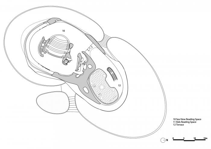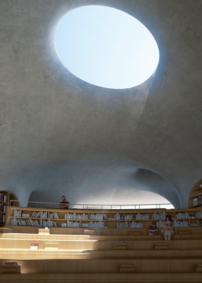 “云洞图书馆”内部功能由两部分组成,其中阅读空间690平方米,可存放万本图书,包含咖啡厅、阅读区和屋顶露台;作为公共服务区的驿站约300平方米,包含自然采光通风的公共卫生间和淋浴间,饮水区,和自行车停靠区。
