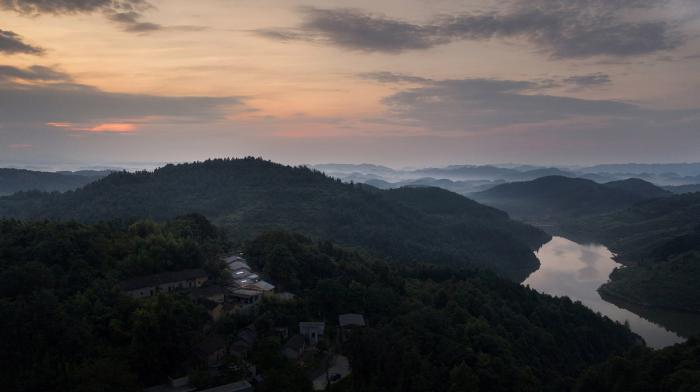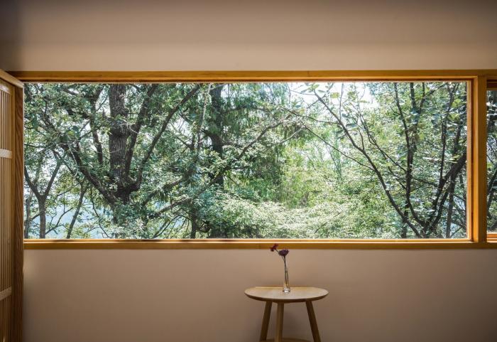除了主体建筑的改造范式之外,我们在局部区域采用了差异化的改造策略。如2号院南侧的房屋保留了原有的夯土砖墙,内部植入钢结构。4号院的南侧扩建了一处茶室,用混凝土板挑出在山体之外,外立面采用全落地玻璃,眺望森林和山谷。