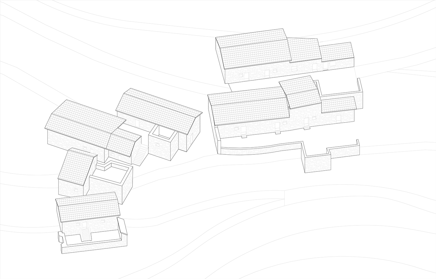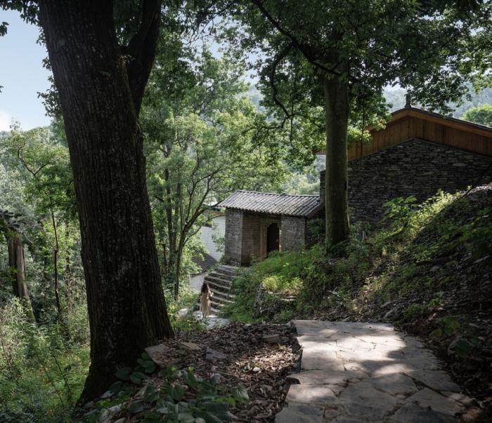拉毫石屋的改造策略为保护原有生态景观,尊重原有场地,复原建筑肌理,最大程度减少对自然环境的破坏。首先在既有房屋的边界控制内,对主体房屋进行改造,仅拆除附属的厕所和鸡舍等。每一栋房屋形成一个院落,院落中原有的树木进行保留,保证私密性的同时形成最大化的的景观视野。房屋之间以石头小径相连,来访者拾级而上,有着曲折迂回、步移景异的体验。