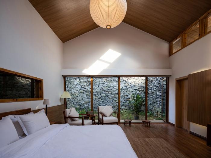 在石墙内部,采取了钢结构体系置入的手段,并将屋顶抬升80cm,让屋顶漂浮在石墙上方。同时,在石墙上部设置了侧天窗,让更多的光线和山林景观进入室内。石墙内部采用钢结构体系,这是一种工业化的手段。一方面,可以应对场地运输的限制和乡村施工工艺的精度问题;另一方面,钢结构体系和石墙体系有机融合,满足了民宿项目的多样化功能需求。同时,使新和旧、轻和重有了强烈的对比,在村落中形成了戏剧化的效果。