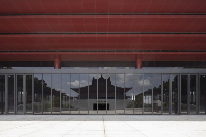 建筑主体采用深灰色玻璃幕墙,搭配以暗红色铝合金屋檐。大面积广场和建筑基座采用白色花岗石,与深灰色主体形成鲜明对比,带有唐风古韵的同时展现建筑稳重内敛的气质。