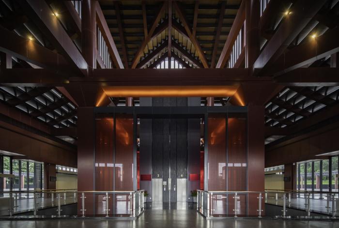 建筑师通过抽象手法,提取传统结构形式,使建筑内外均能统一体现唐风古建的韵味,并根据古建筑的比例关系抽取以及嵌入横向与竖向线条,实现功能与形式的高度统一。