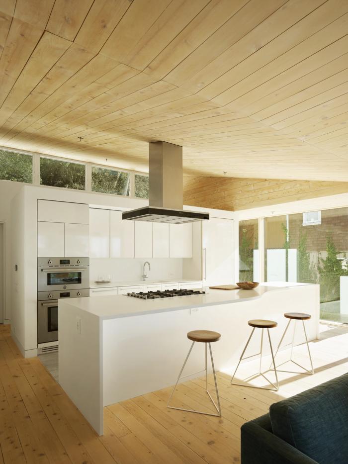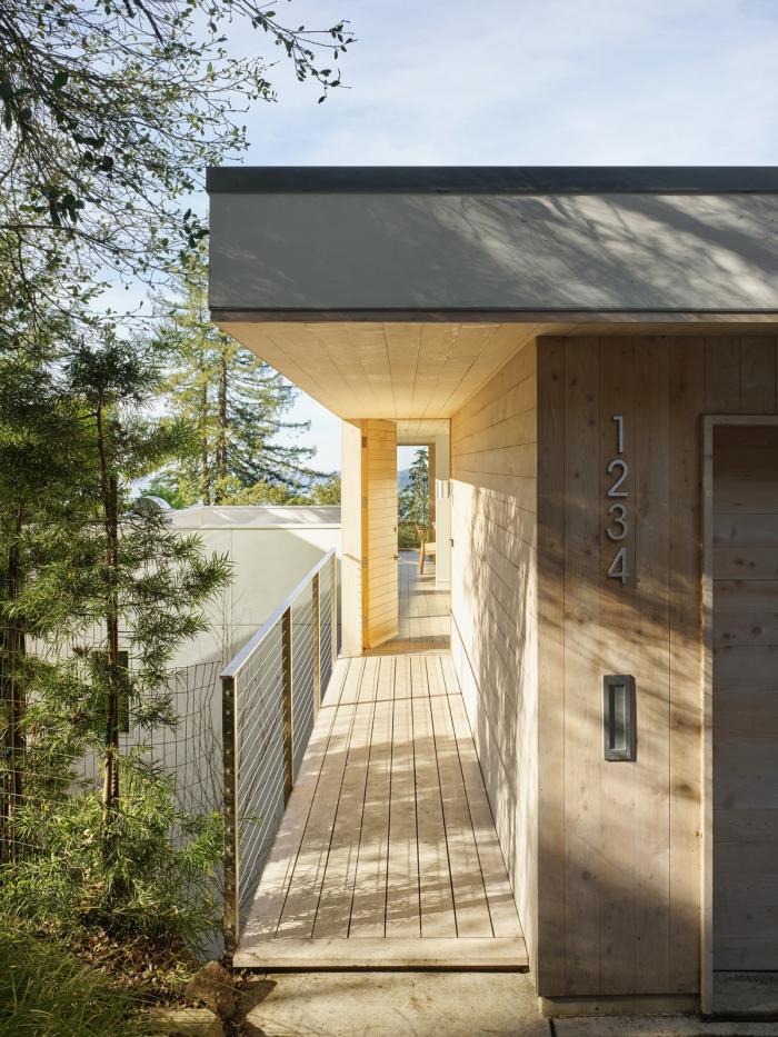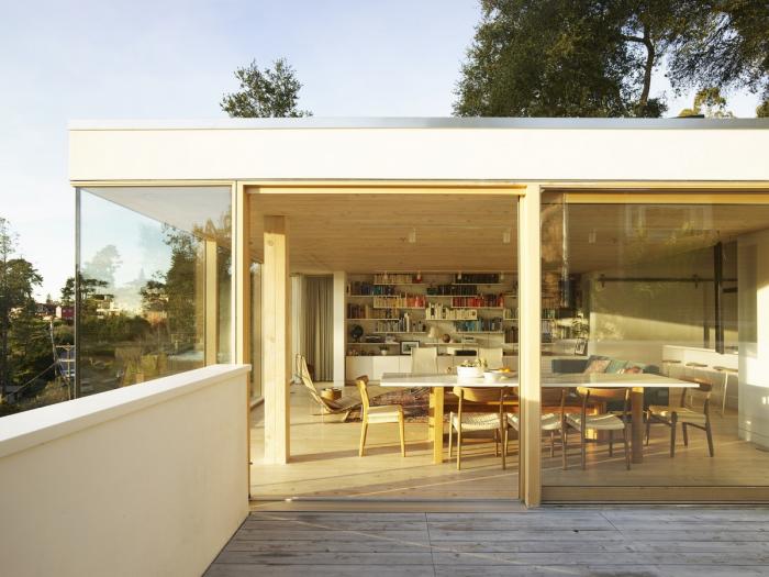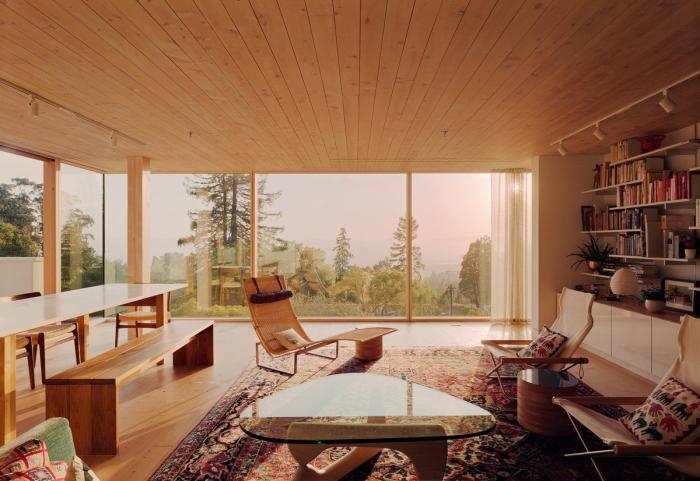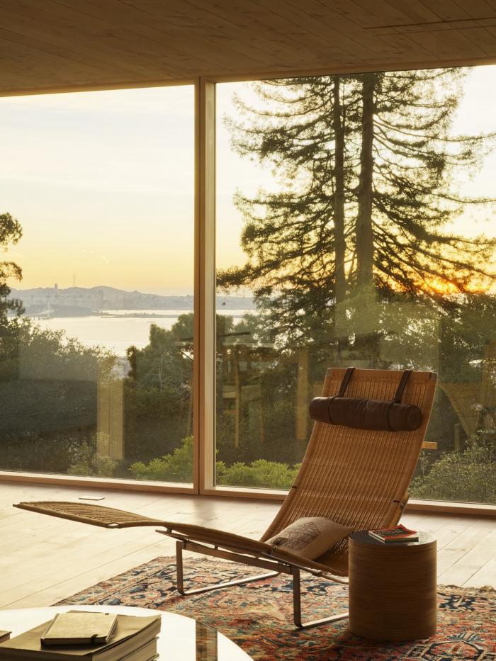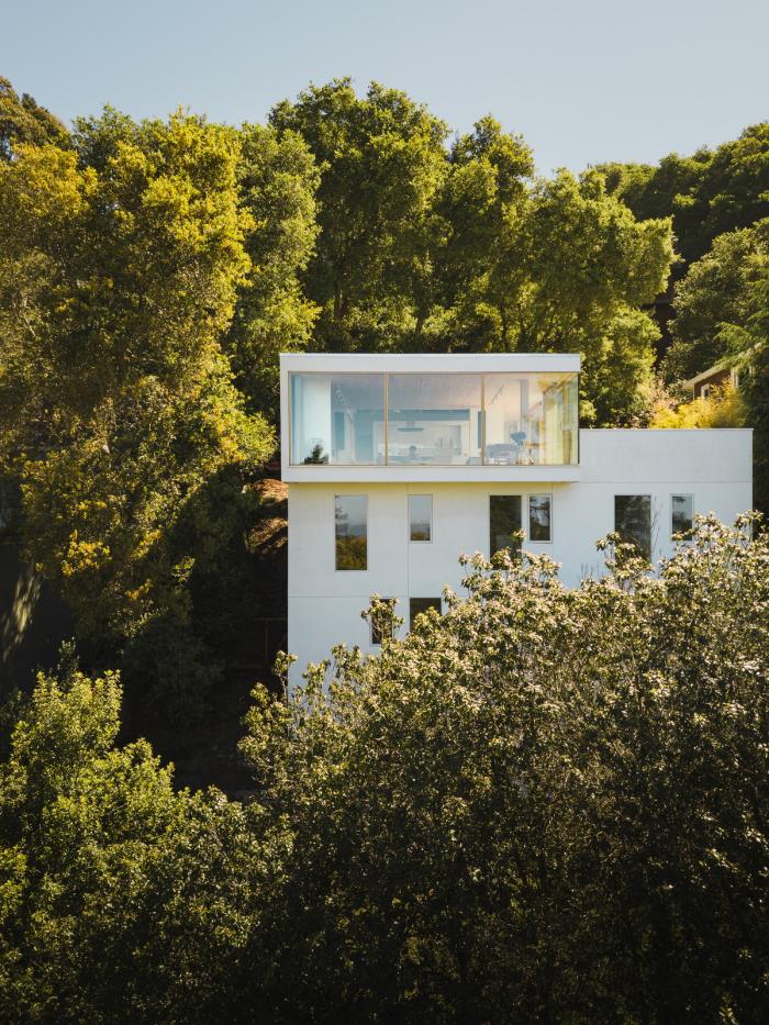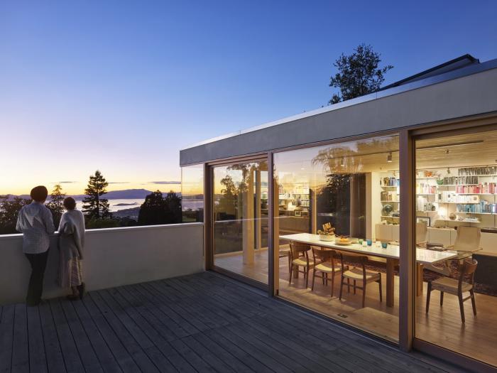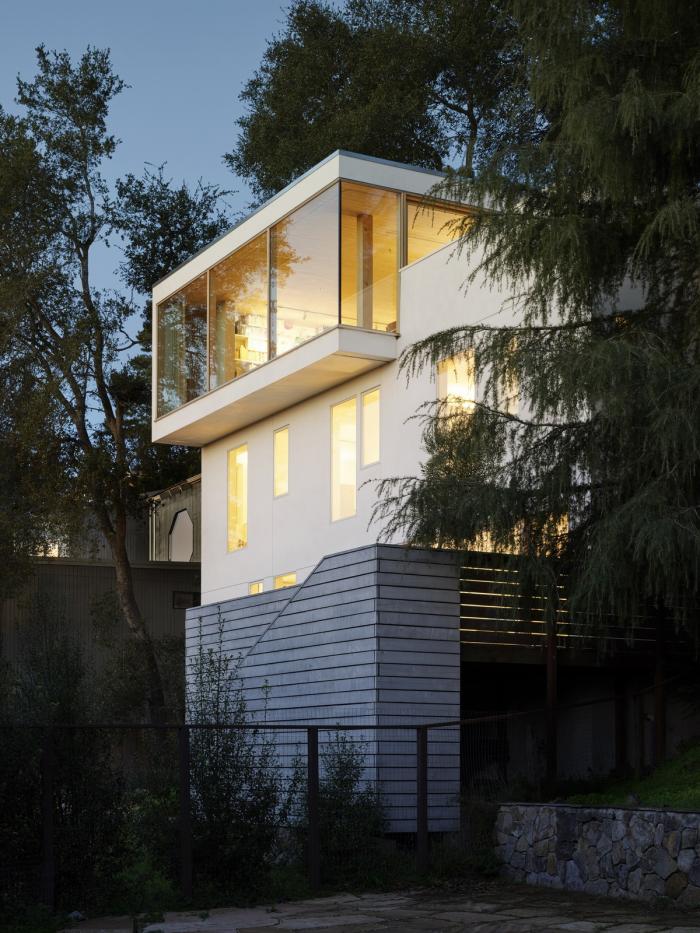 这座三层的房子位于伯克利山,在一个面对旧金山湾全景的陡峭斜坡上,其设计以地震限制、地形、微气候、阳光路径和场地内受保护的橡树为指导。为了应对地震和山体滑坡的风险,房子建在地基梁上,地基梁置于打入基岩的混凝土桩上,避免了挖方和建设挡土墙的麻烦和高额费用。该设计包括首次使用住宅抗震减震框架,它可以减缓结构在地震时的变形,并使结构能够以最小的破坏承受最大可能的地震。