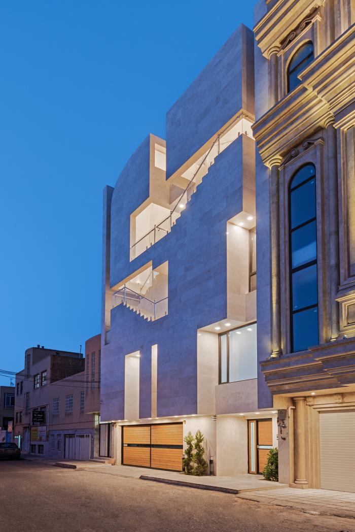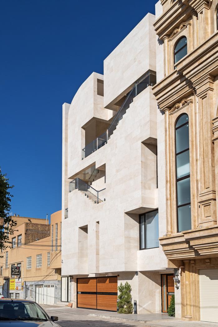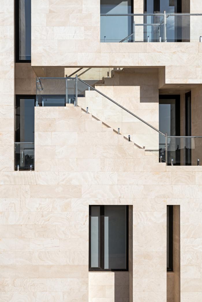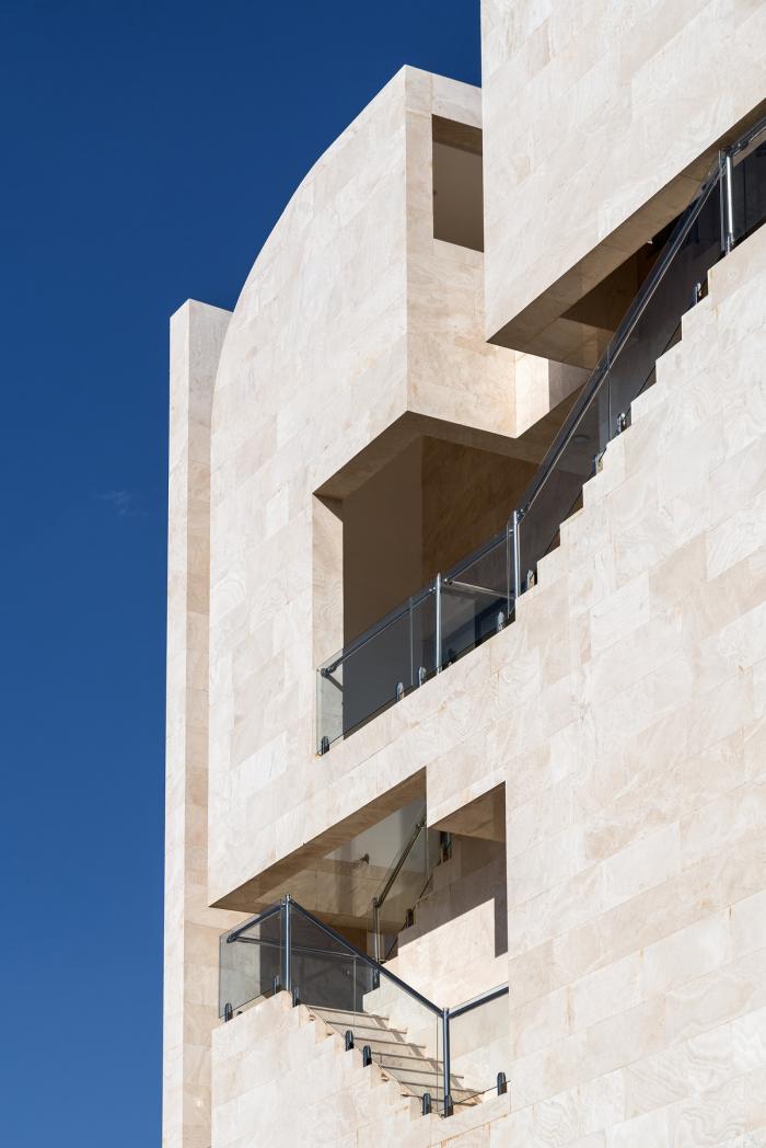 建筑的天际线呈现出弯曲的形状,该形状一直延伸至内部天窗。整个立面的材料采用白色石灰华石材切割而成的。建筑主要采用钢筋混凝土和钢框架丰富立面细节。