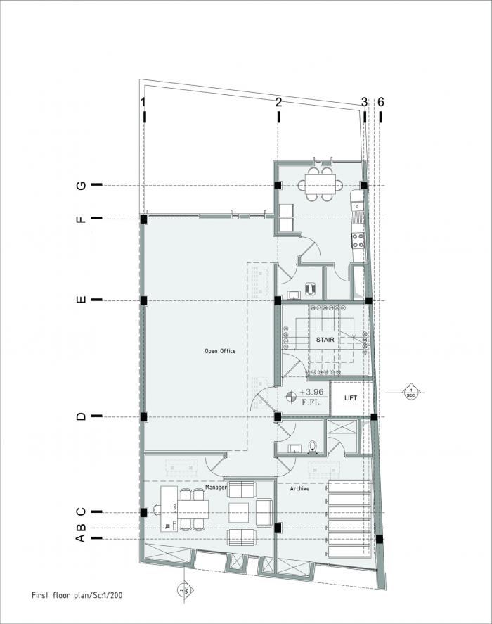 项目要从一位客户的商业故事说起。该办公楼曾经位于一栋老房子里,场地前有一个院子。由于与众多客户进行在线交易,办公室的性质引起了员工之间不断紧张的关系。通过与客户的会面,建筑师发现那里是一个集会交流的地方,就像一个小型股票市场或Bazar。