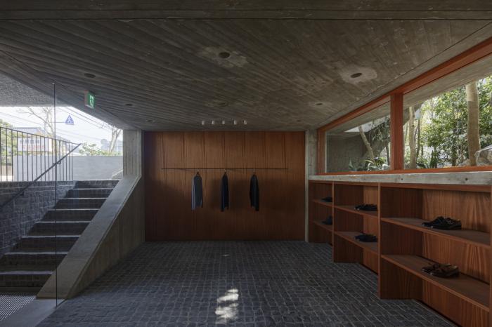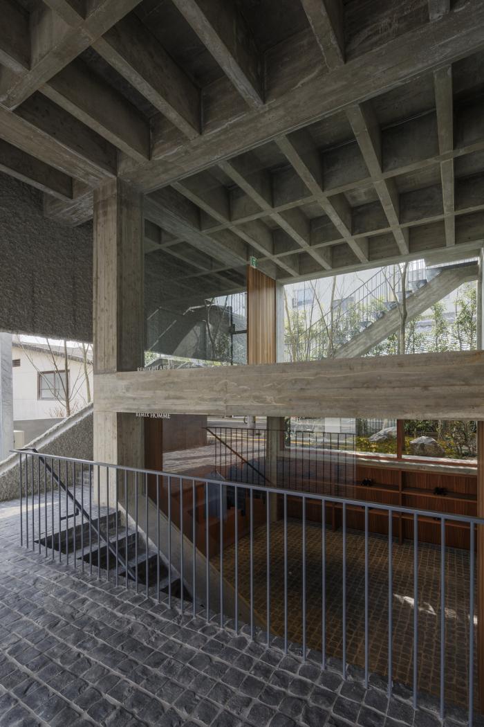 建筑师为了在外部行人视线高度和内部顾客间创造一定的空隙,选择将男性品牌置于地下半层的位置,而女性品牌则相应地于地面抬高了半层。而环绕商店的混凝土梁和柱,则在建筑厚重的混凝土外形中,创造了一定的缓冲区域。