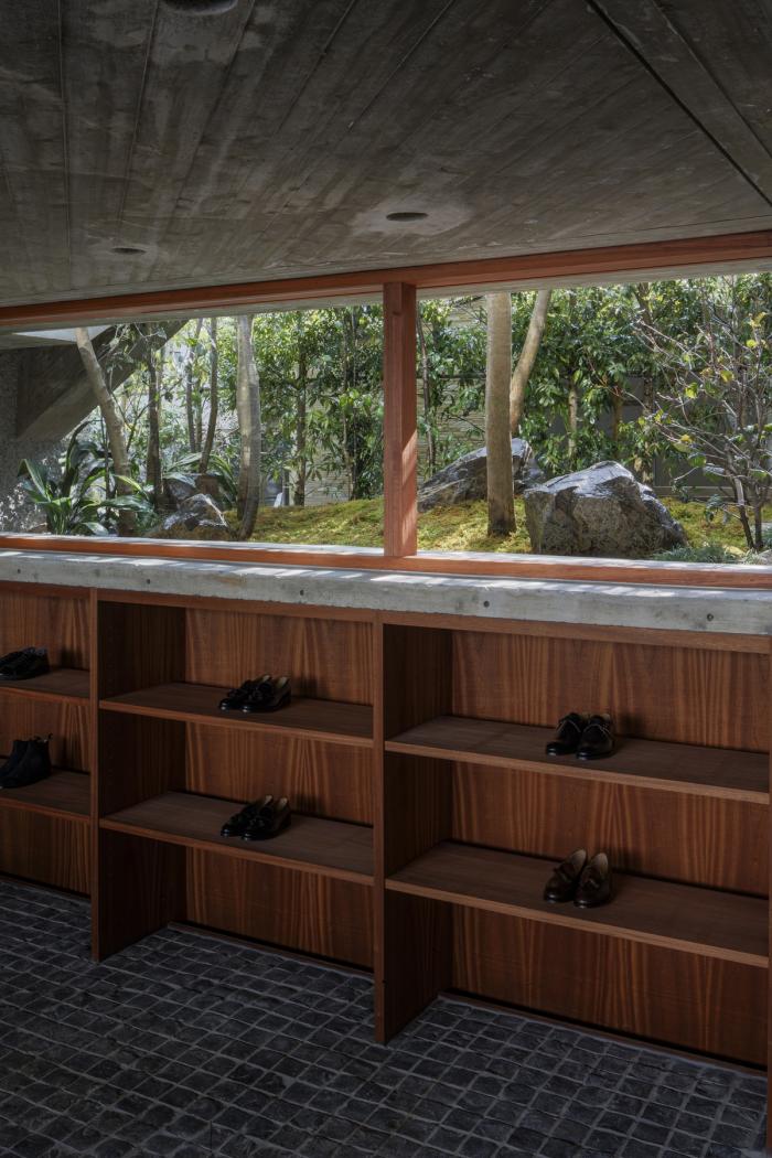 建筑师利用重复的混凝土晶格来引导顾客入店消费。而顾客一旦步入商店内部,其就会被强烈的水平线条和厚重的混凝土体块所震撼。