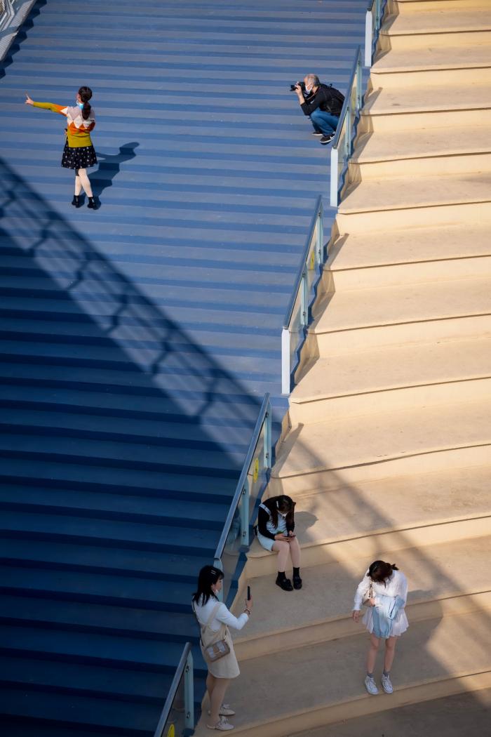 在构造上,桥体分为主桥和副桥,主桥在上,全长346.89m,宽度4.65m-9.88m变宽;是连接两岸绿道可供自行车顺利通行的桥体;副桥在下,全长208.78m,宽度6m-14.53m变宽;有观河的环绕式剧场台阶,为公众提供别样的停留体验。同时夜景照明上主要是突出此桥独特的桥型之美,因此做了简单大气的现代化泛光照明处理,希望在锦江上勾勒出别样的风景。