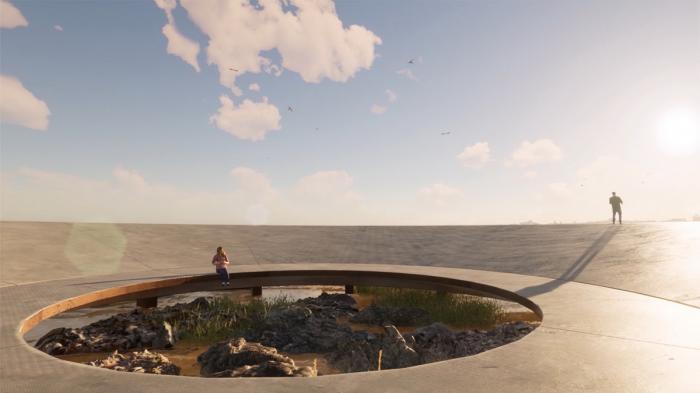 其凹面会使用混凝土,底部表面则使用耐候钢——一种随着时间推移,露台和雕塑周边的水位会变化,其自身会自然风化却几乎不需维护的耐用材料。