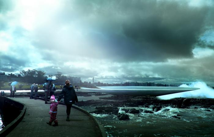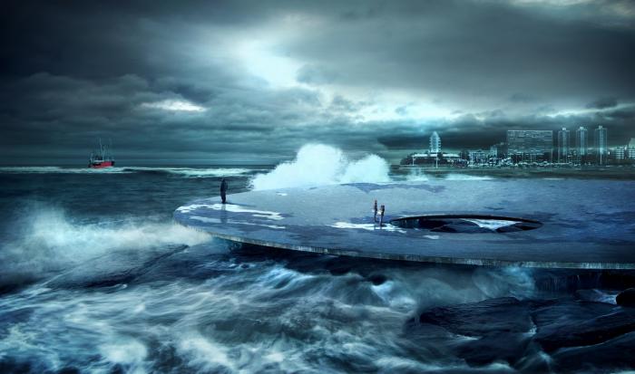 一条长长的人行道从海滨延伸向直径达40米的主环状平台。在“雕塑”的中心,有一个10米宽的洞口,岩石和下方的水在洞口穿过涌动。