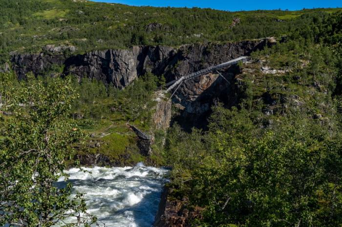 Carl-Viggo Hølmebakk建筑事务所与挪威公共道路管理局(NPRA)合作打造的沃林斯福森阶梯桥横跨47米(超过150英尺),99步阶梯。桥两端的高度差是16米(超过50英尺)。尽管桥梁的七个构件被起重机适当吊起并在现场装配,但整座阶梯桥是由钢制的,并被结实的岩石螺栓钻孔嵌入岩石之中。项目经理谢斯蒂·伍德(Kjersti Wold)评论道:“哈当厄尔国家公园新开放的阶梯桥项目是具有‘开创性的’。”