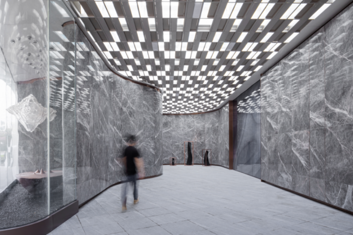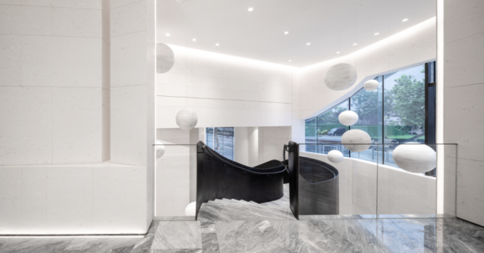 从北侧道路进入场地,沿着建筑曲线线条进入首层入口空间,向内无明确建筑边界延长纵深视觉,两侧使用大理石和玻璃,屋面线性排列镂空玻璃砖和钢结构砖框,三个不同界面的围合使建筑空间更加开放和神秘。同时,建筑曲线形态伸展至室内空间,不规则的墙体和旋转楼梯,与建筑的城市界面呼应,也为之后的商业空间出售带来更多可能性。