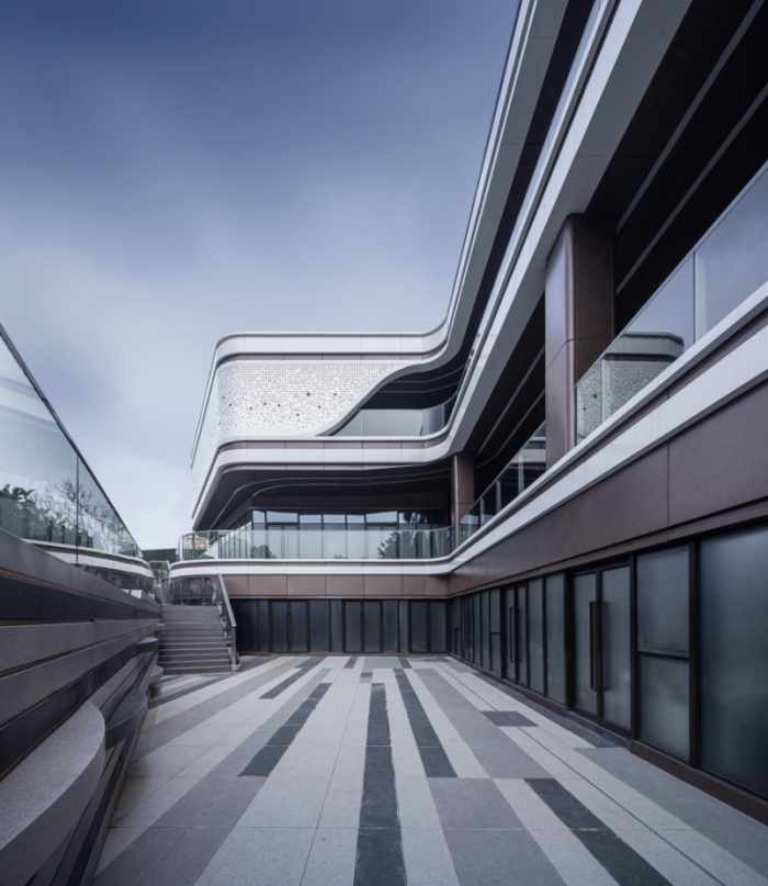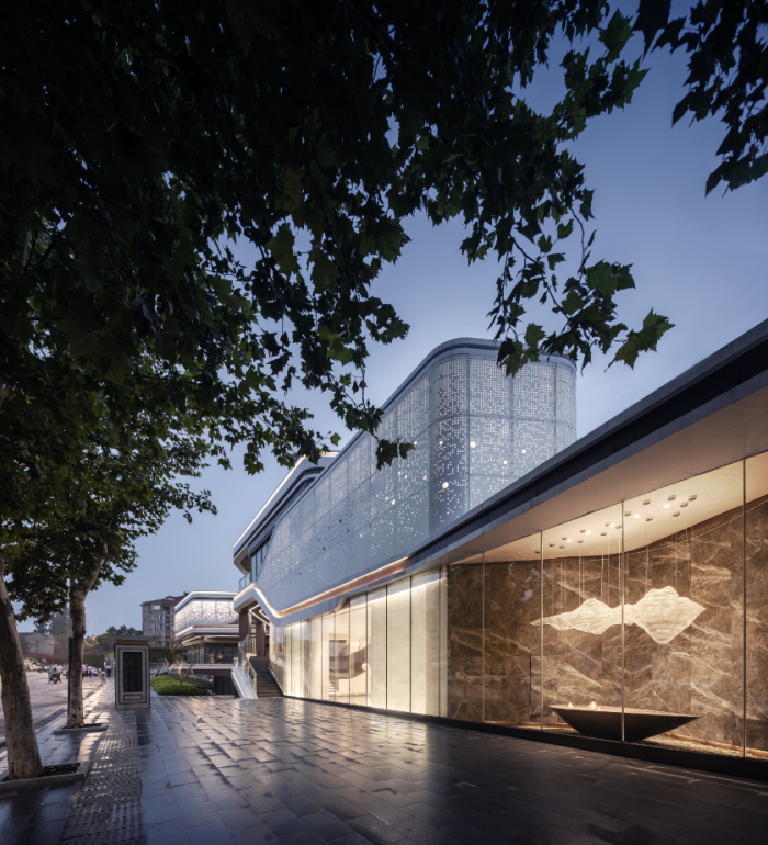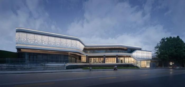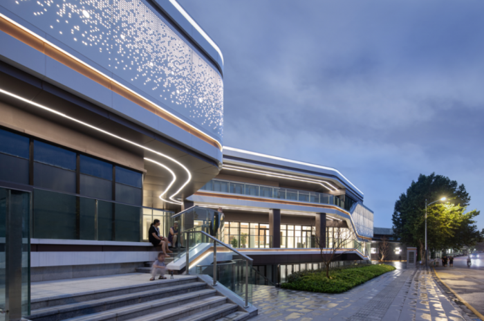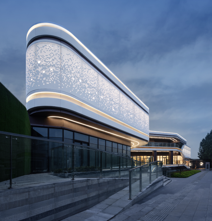 社区服务综合体的立面,多条曲线线条滑动,延展建筑体量。采用参数化设计模拟幻彩穿孔铝板肌理,为外部带来形象提升,为内部空间带来光影变化。到夜晚,动态灯光营造浩瀚星空的氛围。