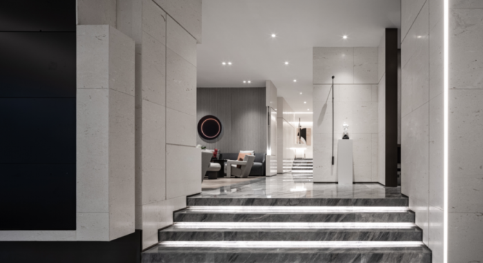 在住宅部分,楼与楼之间间隔近30米,楼间距和景观最大化,双庭院成为居住空间与公共空间的重要“胶合剂”。共建化立面,檐口、阳台和窗部分,使用弧线与咖色相结合,与南京雨花石传统材料呼应,将城市文化融入。将空调机位和冷凝水管等设备隐藏在百叶后,增加整体性,对形象提出审美的提升。