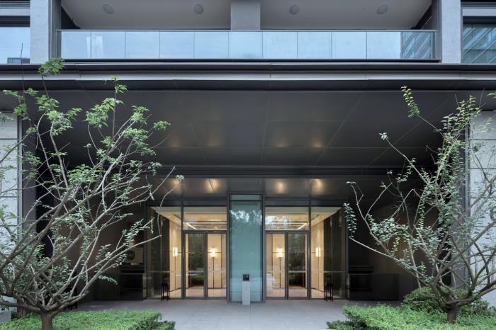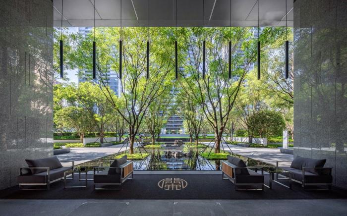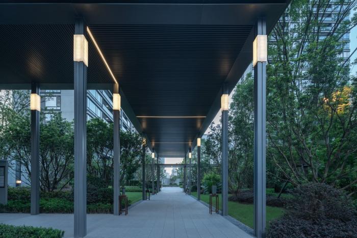 蘭园中心庭院讲究轴线对称的秩序,铺垫入户过程的仪式感,中央水景则弱化了对称空间的凝重,调节局部气候环境。借鉴度假酒店公区,首层架空高度达5.5米,采用500米风雨连廊连接入户雨棚,增加与庭院互动的多重场所,从公共逐渐抵达私密。内部静谧空阔的庭院与外部烟火气浓郁的市井风貌形成界定与层叠,“大隐于市”的生活愿景在这里得以诠释。