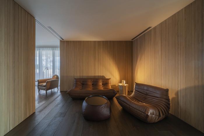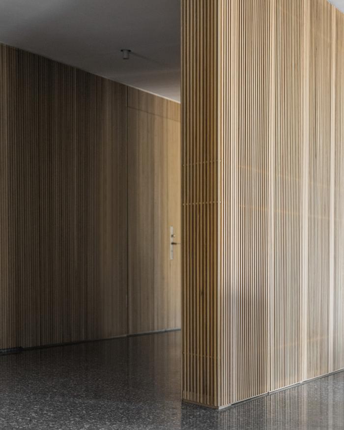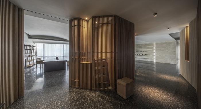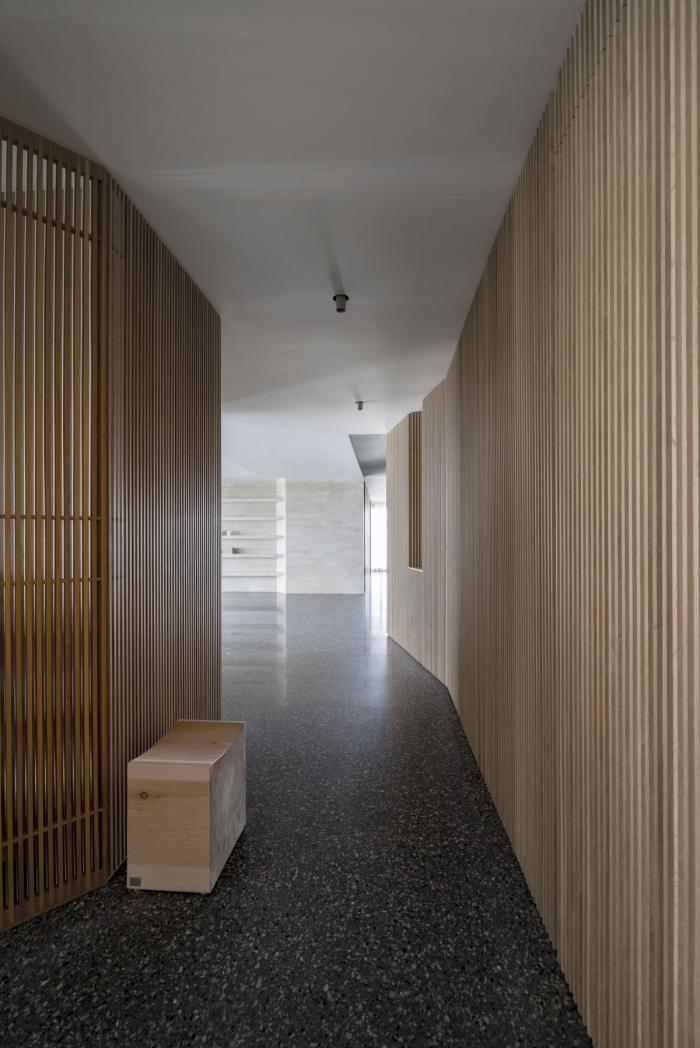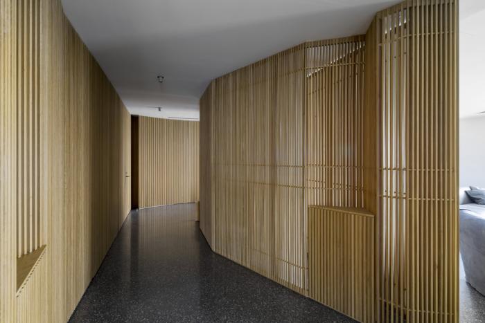 入口由上千根实木条排列出的墙面,在打乱而重新排列的木纹中展现了深浅自然律动,非矩阵编排的墙体塑造艺廊廊道,自然分流步向书房及更深层的室内动线。
