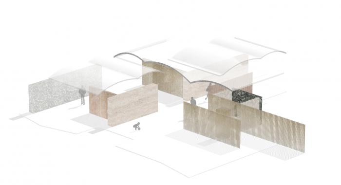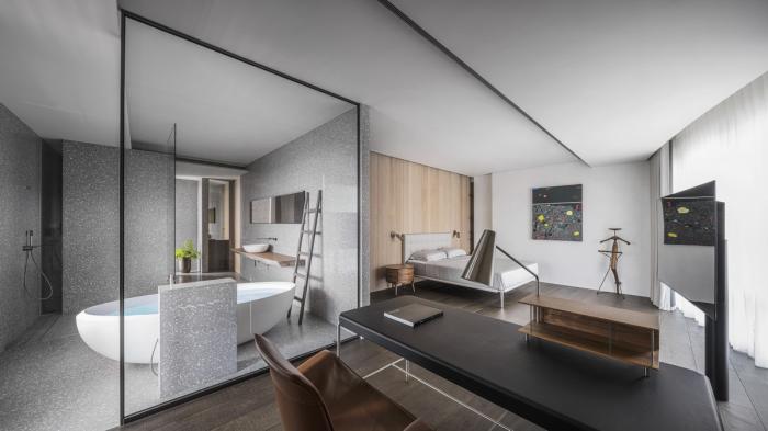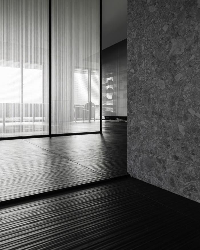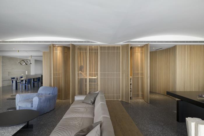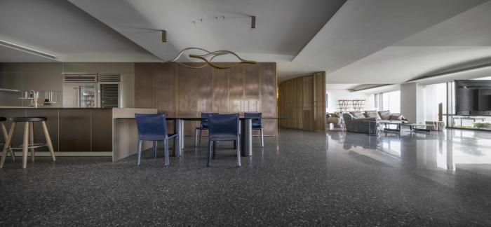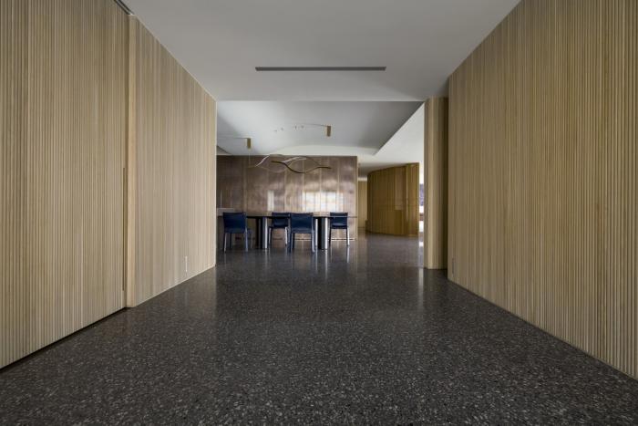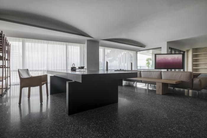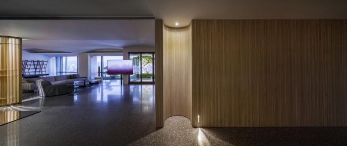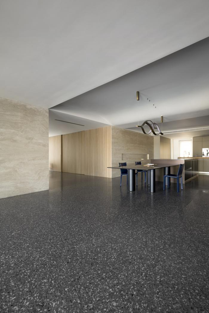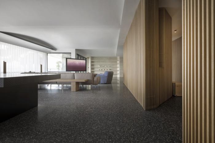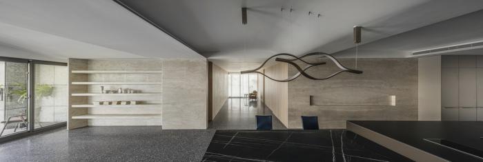偌大公共区域,每处由材质建立份量的底墙都是一个场景,随家具摆饰及生活演化定义其属性,过道或座席、线与形、虚与实,都是边界弹性而模糊的存在。