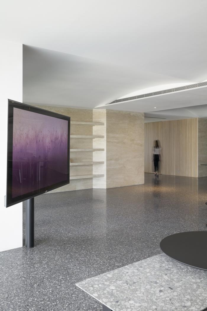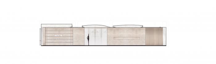 相较于墙体张力十足的材质变化,天花板是完整但素雅沉静的系统,离地一致的高度之上,以波浪状有机曲度跨越各区块,脱开立面材质演变的穹顶,采用一致的视觉符号——白色,整合平面自由的室内空间。