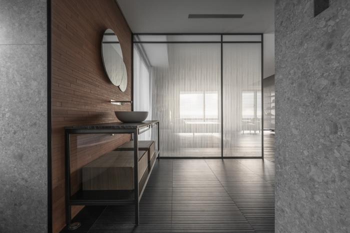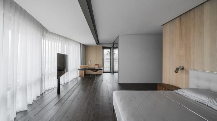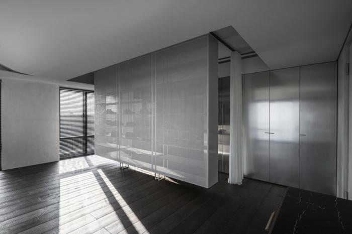 本案基地方正、尺度大而使用人数单纯,空间布局与机能相对有弹性。业主讲求整体呈现低限度的中性质感,如何安排材质凸显量感、造型力道并以其质感特征表述生活调性,成为水相设计规划空间风格的着力点。