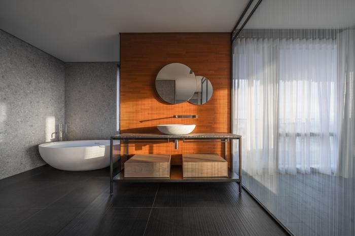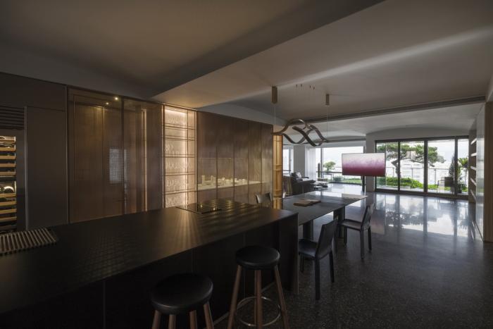 岛屿般的轴线柱体,透过格栅编排成一座轻盈的量体,厨房旁镀钛冲孔网柜门的朦胧透视亦然,它们的内部照明与自然光交织成温驯的光,在低限线条的空间展现戏剧张力。