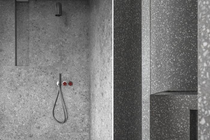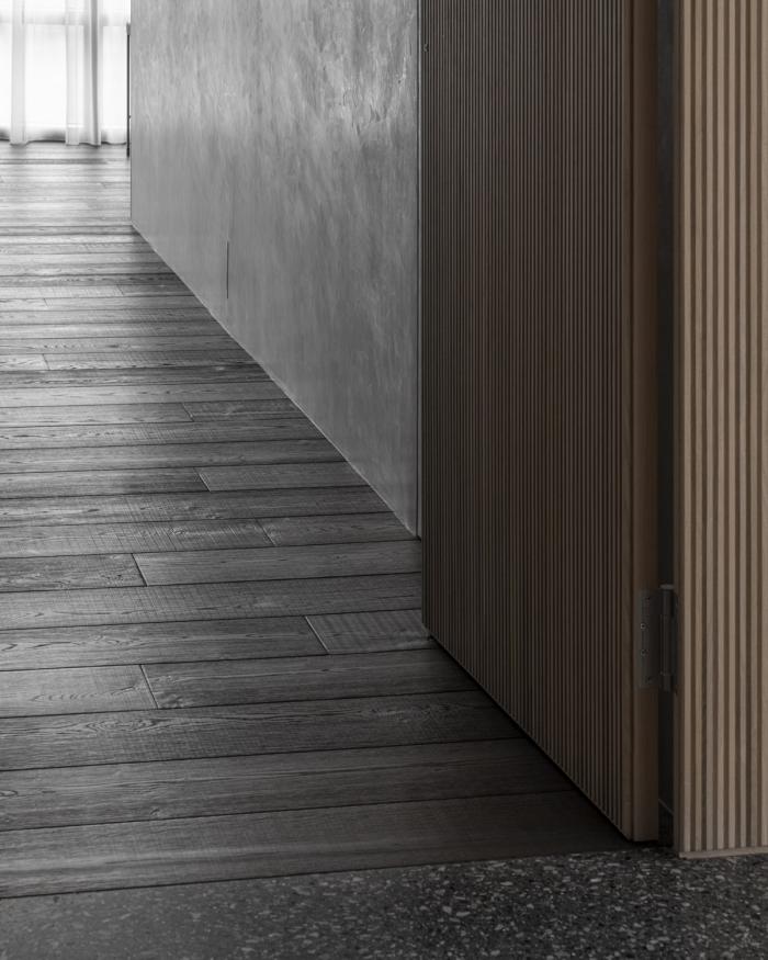 地面自然渐层的义大利黑色系水磨石、纹理天然的洞石、立体而富量感的山毛榉实木,选择之初,即希望藉由它们的特质随日光及使用轨迹累积出值得等待的醇厚。