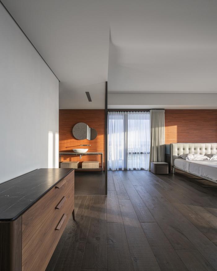即便在卧室里,顺应窗景布局的多向度动线,也强化了室内行为不受造型拘束的设计精神。
