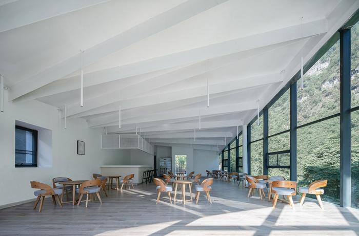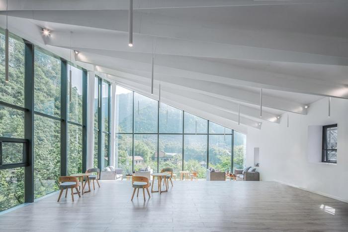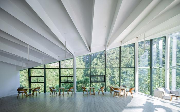设计团队认为在这样的自然环境中,建筑室内空间应该是平静且简约的,不应该因为过于繁复影响人们观赏窗外的自然美景。崖顶茶吧的室内采用了白色和木色作为主基调,墙面和顶面均为简单的白色,地面面采用浅木色地板,舒适且温馨,阳光透过巨大的玻璃幕墙洒下,将美景引入到室内空间。
