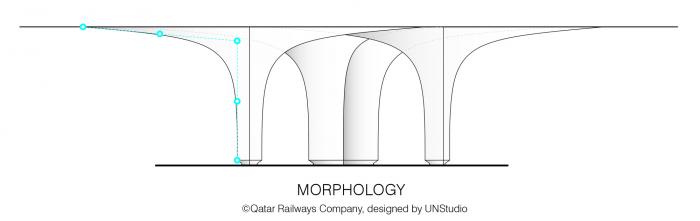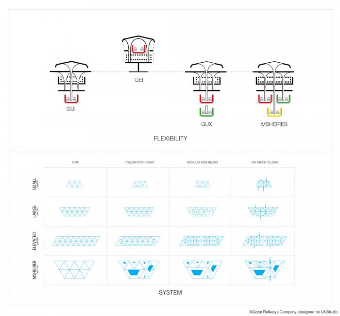 “通过设计指南的制造和自适应参数化设计的使用,建筑师可以打造拥有多种变体的建筑,并且这种变体在所有车站中都拥有统一的标识。这种设计方式将当地环境特征的差异性以一种复杂却又极其系统化的方式,融入在总体特征和自适应参数化物理元素中,并包括了导向系统、日光穿透、客流、建设性要素等。