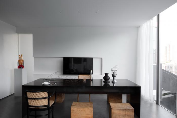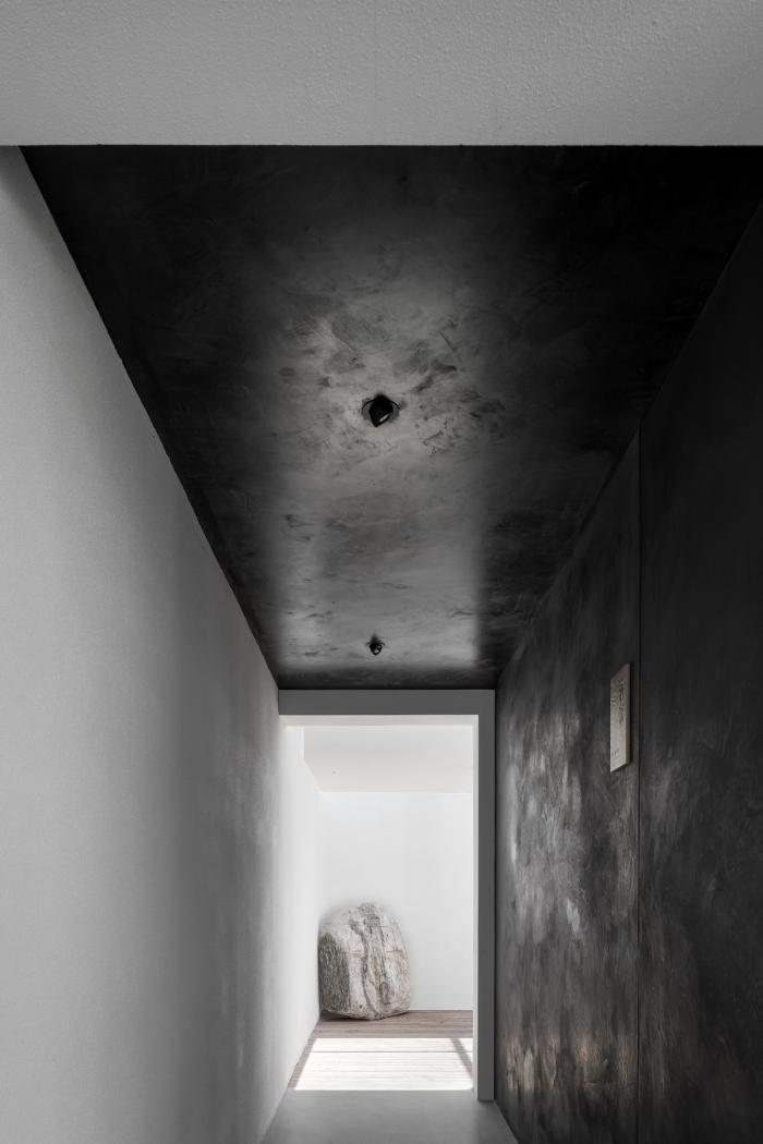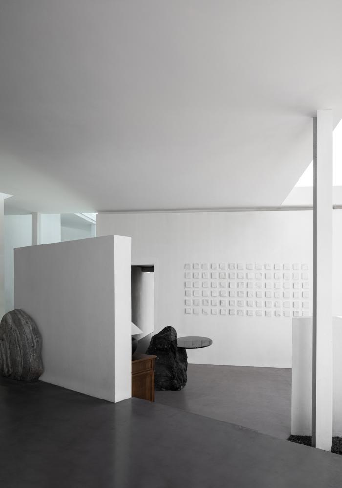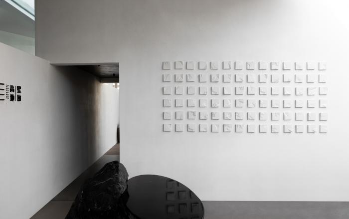 入门处思索的大白熊,如同匆忙而来的我们,思索人生太多的繁杂而希望寻找一处宁静。阵列排序的立体挂件表面,宛如山的自然起伏之势。日照阳面的清晰轮廓和阴面的倒影,与天然黑山石打造的前台相互辉映。漫步的阶梯后,去往由盒子结构白色墙体组成的悠长通道,通往餐厅的包厢区与休闲活动区。