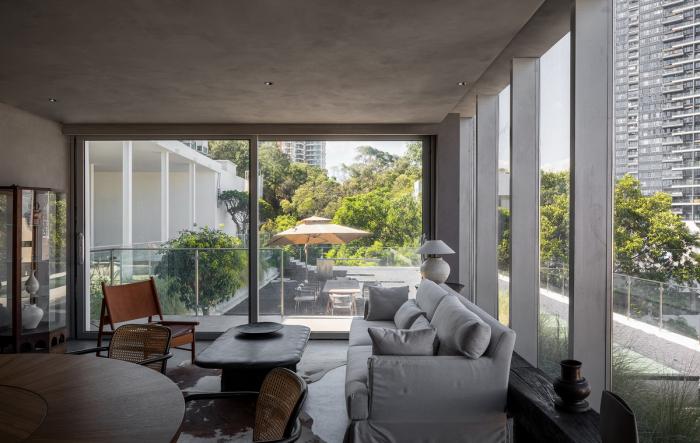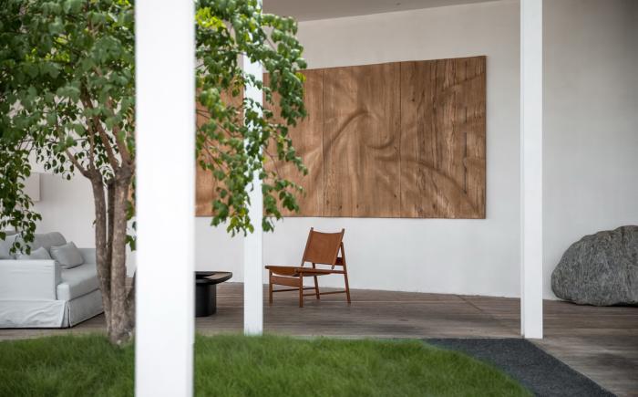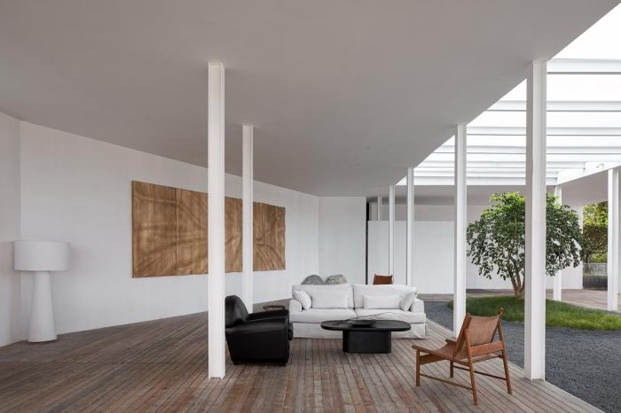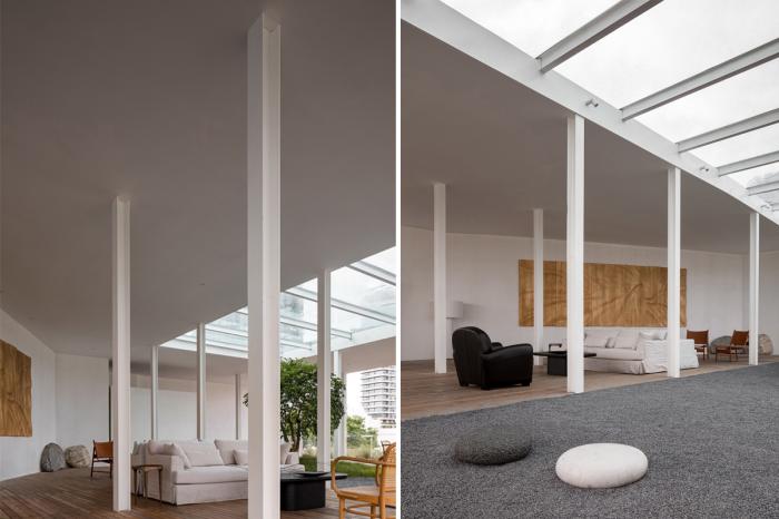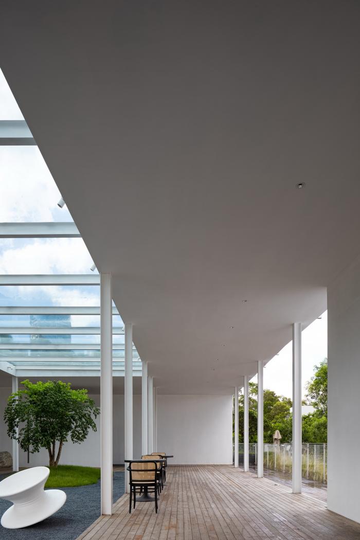 我们想让空间的结构与自然产物相互结合、合为一体。所以结构上尽量采用轻盈且富有张力的工字钢结构支撑,奉行现代主义建筑的精神:「自由平面」与「流动空间」,简单的立面与精致的材质,创联每个空间的室内外关系。让人寄予自然之中,能享受自然赋予的时光。