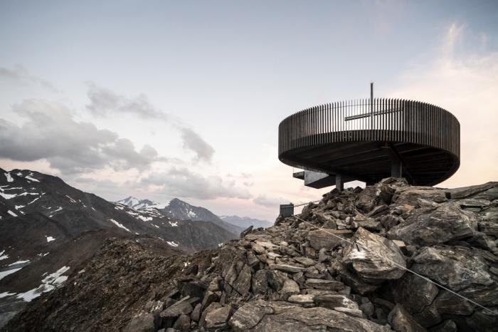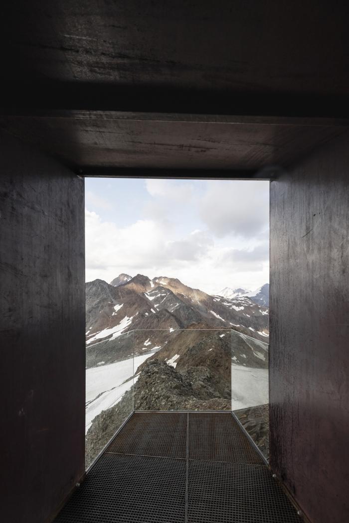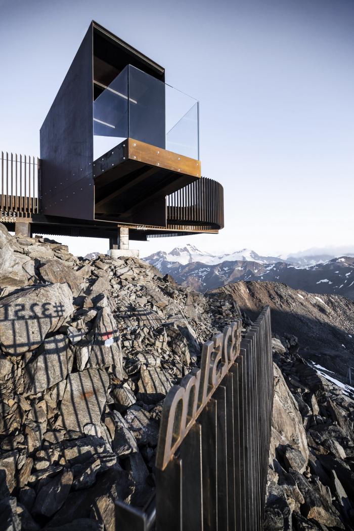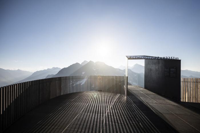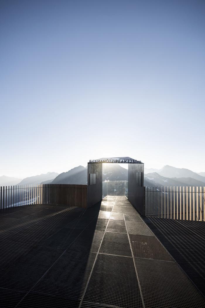 说到时间,一个漏斗状的体块嵌入了波浪状的观景台,将观者的视线引向永恒的景色——那就是冰人奥茨的发现地。就在离奥地利边境仅有几米的地方,“视线漏斗”将人们的视线引向一段精心制作、讲解知识的通向冰人的旅程。视线漏斗由耐候钢制成,就像栏杆上的板条一样,铁呈现出暗棕、灰色和黑色,顺应场地的元素并与环境融为一体。漏斗的尽端是一个玻璃栏杆,给你一种类似飞行的激动人心的悬念——好像正在空中行走一样。