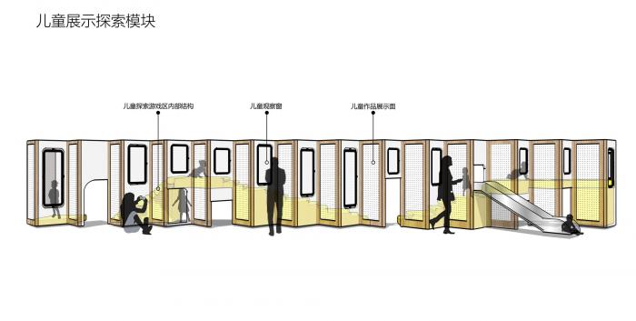 我们希望实现一种有效的社区,家校互动体验,所以将户外的围墙随时可以“变身”为小集市的窗口功能。另外室内的攀爬活动区的同时也是文化作品展示墙,为举办文化类或家长开放日的活动做准备。希望孩子的作品能够像艺术品一样更正式展示陈列出来。